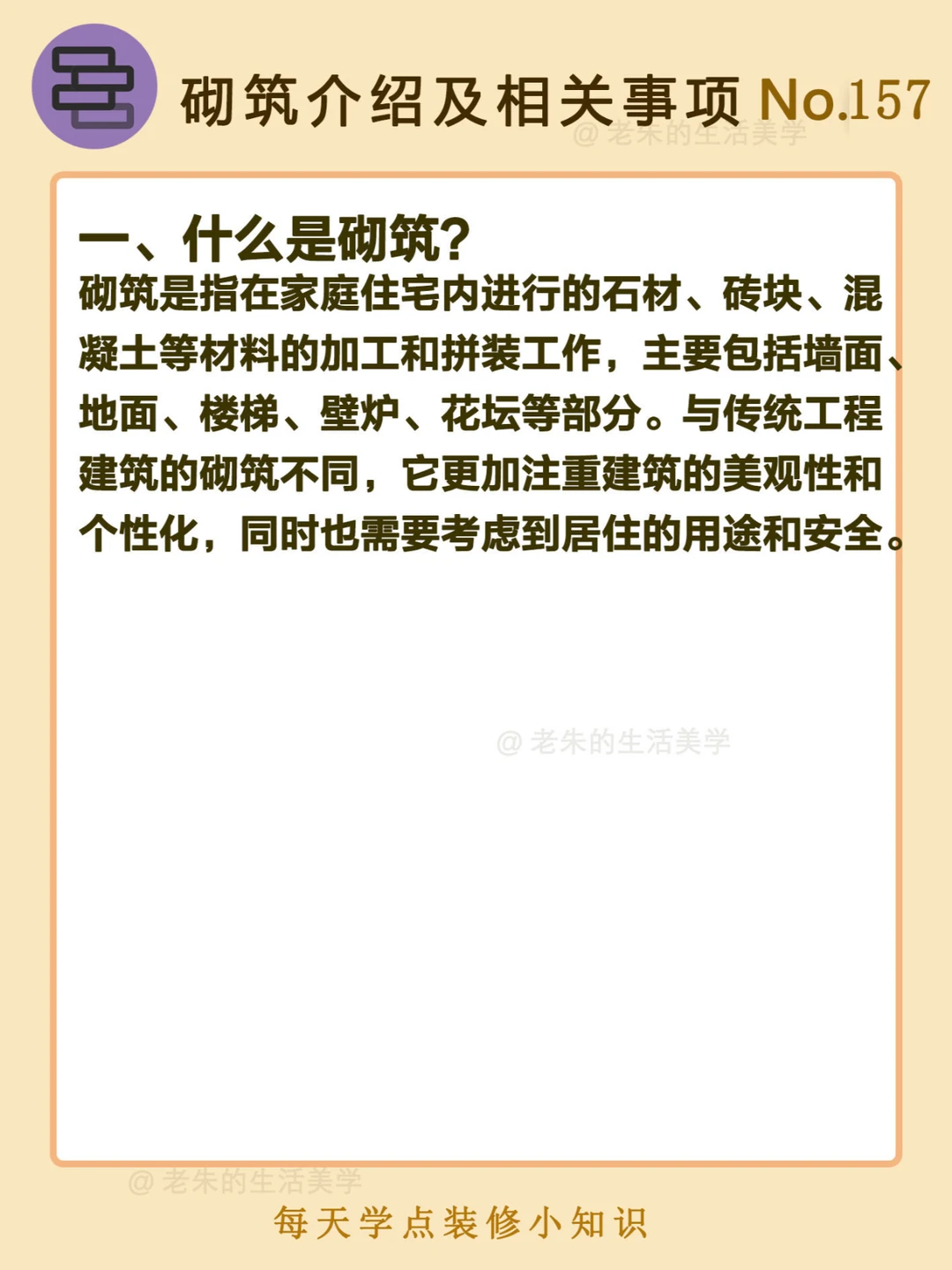 [哇R] 一、什么是砌筑? 二、什么情况下需要做砌筑 三、如何检查砌筑处理质量好坏 四、砌筑的注意事项 🔆 我是老朱 📍坐标天津 前上市公司金牌工长🏅 30年施工经验🛠 承接天津新房装修/老房改造 精心整理关于设计&施工&装修的攻略📝 关注我每日更新🗓 也可以在评论区留下您宝贵的想法与建议💓 让您装修不走弯路✅