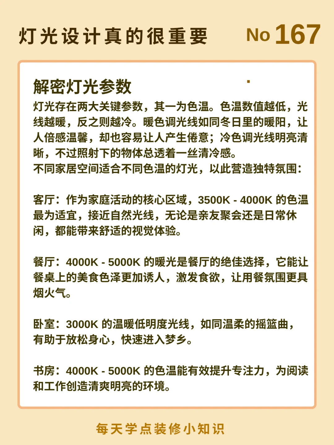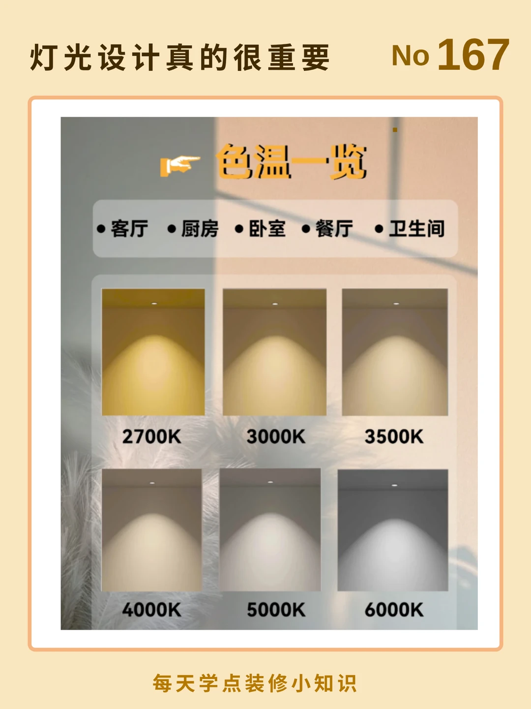 灯光存在两大关键参数,其一为色温。色温数值越低,光线越暖,反之则越冷。暖色调光线如同冬日里的暖阳,让人倍感温馨,却也容易让人产生倦意;冷色调光线明亮清晰,不过照射下的物体总透着一丝清冷感。