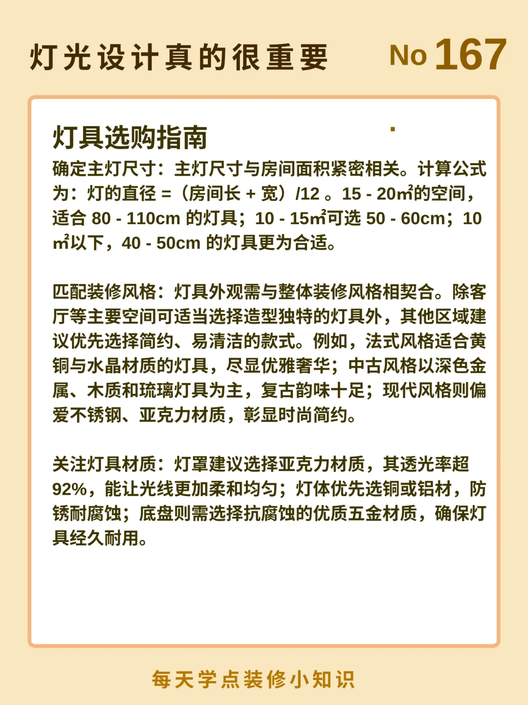 确定主灯尺寸:主灯尺寸与房间面积紧密相关。计算公式为:灯的直径 =(房间长 + 宽)/12 。15 - 20㎡的空间,适合 80 - 110cm 的灯具;10 - 15㎡可选 50 - 60cm;10㎡以下,40 - 50cm 的灯具更为合适。