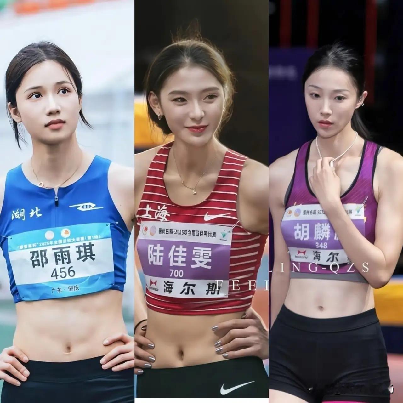 这三位田径姑娘也太亮眼了,左边湖北队的邵雨琪,蓝背心配利落马尾,赛场气质又飒又清爽;中间上海队的陆佳雯,红条纹运动装衬得皮肤超白,笑起来好甜;右边胡麟鹏这身紫背心+黑短裤,肌肉线条利落又好看,妥妥的“力量型美女”!赛场上是风一样的选手,颜值身材还都这么能打。