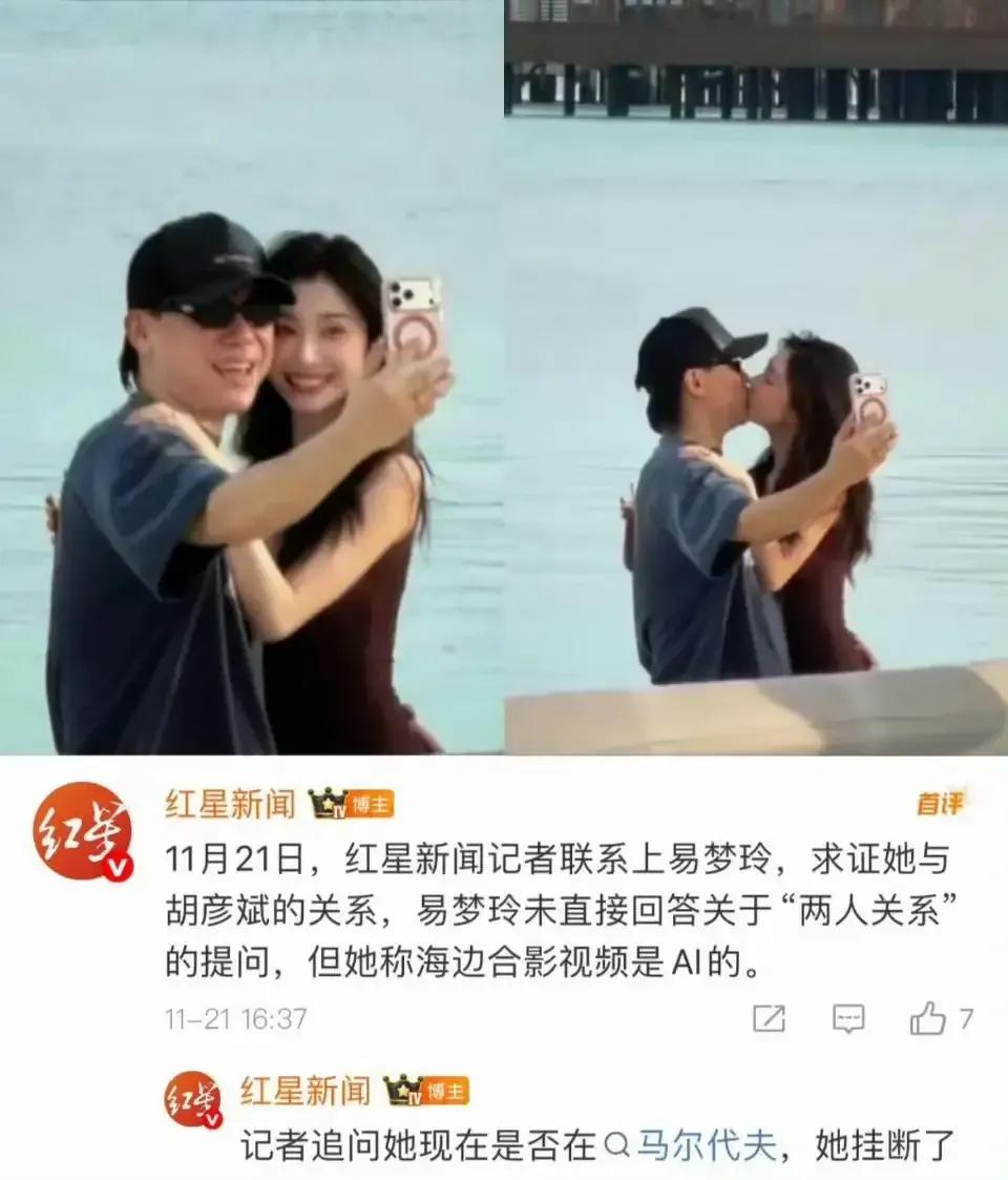 这恋爱谈得,像是胡彦斌追着要名分! 胡彦斌和易梦玲被拍到在马尔代夫海边接吻,恋情正式曝光。视频里易梦玲很主动的凑上来亲吻胡彦斌,然后微笑看着对方,胡彦斌咧着嘴笑开了花。 随后,网友晒图在马尔代夫机场偶遇易梦玲和胡彦斌一起回国,胡彦斌还让网友帮忙辟谣,说和易梦玲的视频不是AI。易梦玲的朋友解释因为易梦玲以为是私生打来的电话,就随便骗他的,谁知道记者直接拿去用了。 但红星的记者辟谣,说一开始就介绍了自己是红星新闻的记者,还发了整段通话录音。如果不认识,不是应该直接挂电话吗?还会说是AI? 感觉女方想否认,没想到对面是真的记者,还给录音发布了,好抓马[捂脸]所以,他俩不能公开的原因是???大大方方承认会怎么样啊,胡彦斌很差吗?有钱有才,对女朋友又好,真AI还是假AI不仅当事人清楚,大家也都心知肚明。胡彦斌都是从不遮遮掩掩的,历任女友颜值都很高,当年也是爽子心爱的人啊。。。