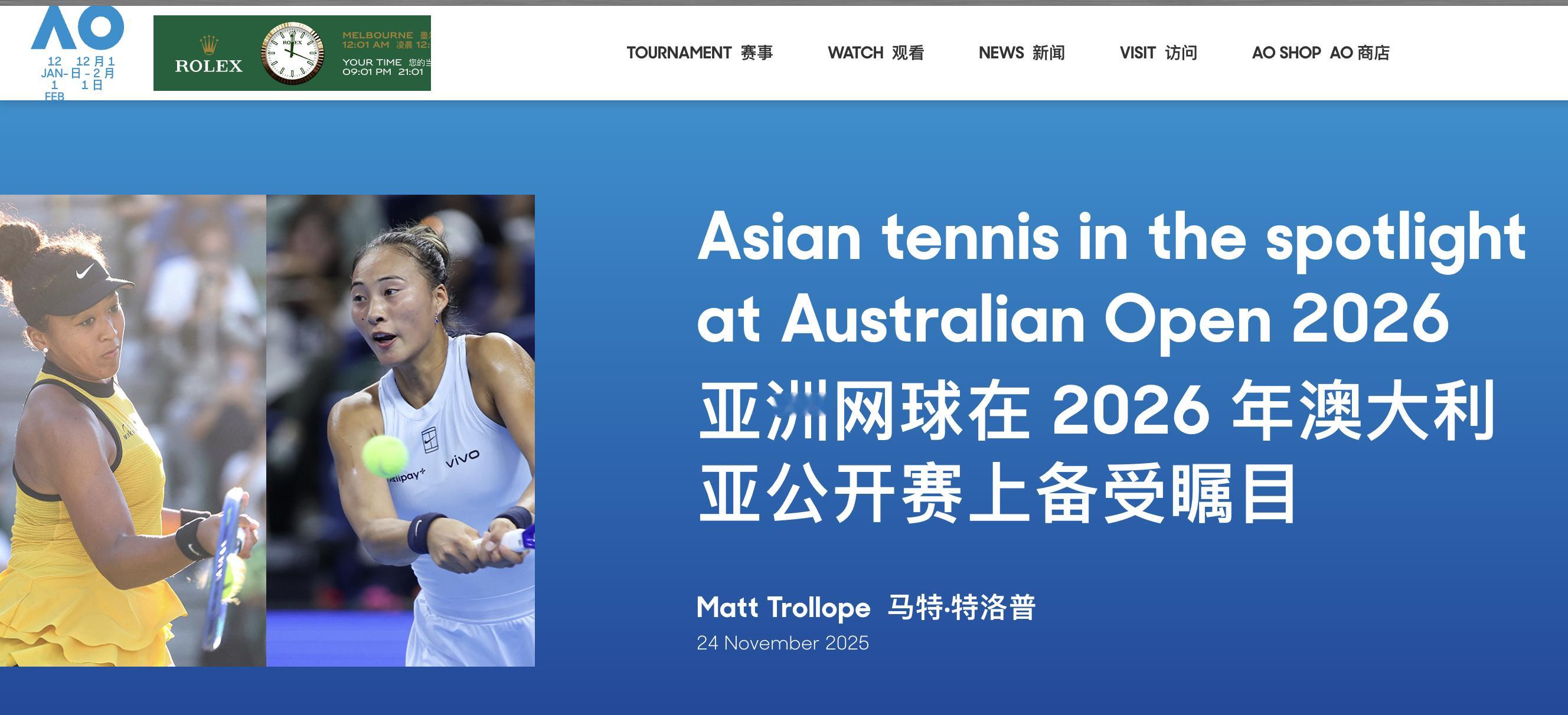 澳网官方发长文,为明年参赛的亚洲选手们造势,郑钦文与大坂直美登上头图📷全文如下✍️近25年来,澳网一直被誉为亚太地区的大满贯,随着2026年澳网临近,这一殊荣更显耀眼。日本的大坂直美和中国的郑钦文等超级巨星在墨尔本公园的出色表现,进一步推动了本已庞大的网球粉丝群体和澳网转播市场。由于菲律宾偶像埃拉和印度尼西亚新星曾丽美的崛起——这两位选手来自总人口约4亿的国家——亚洲观众有望进一步增长。随着2026年的临近,亚洲男子网球也备受关注。日本头号男单望月慎太郎将与大坂直美携手,代表日本队出战赛季首项团体赛联合杯,而中国三杰张之臻、商竣程和吴易昺都在伤愈复出后展现出良好势头。他们紧随令人振奋的中国头号男单选手布云朝克特之后,布云朝克特将在成都争夺澳网亚太区男子正赛外卡。与此同时,战无不胜的世界第一轮椅网球选手小田凯人和上地结衣被视为2026年澳网轮椅网球男女单打冠军的有力争夺者,而近期澳网青少年组冠军坂本伶和园部八奏双双超越澳网资格赛排名截止线,亚太地区选手的身影贯穿为期三周的澳网全程。这四名选手均来自日本,日本是澳网第五大转播市场。近十年来一直如此,WOWOW公司将澳网赛事送入日本球迷家中,该公司是澳网历史最悠久的转播商之一,双方合作可追溯到1992年。随着日本超级球星锦织圭在2012年至2019年间四次晋级澳网四分之一决赛,日本观众人数不断增加,并在大坂直美2019年女单决赛惊险战胜科维托娃后飙升至2000多万。这些数据使其成为2019年澳网期间日本收视率最高的电视节目,也意味着它成为该国过去四年来收视率最高的赛事转播之一。2025年澳网日本收视时长同比增长34%,这无疑得益于大坂直美和锦织圭的参赛——两人均在早期轮次获胜——且赛事时间与日本时区高度契合。前世界第一大坂直美在蒙特利尔决赛后强势重返世界前20,并在美网半决赛中复苏,这增加了近期在东京举行的2026年澳网日本启动仪式上的期待情绪。澳大利亚网球协会首席商务官表示:"日本与澳网之间的联系每年都在不断加强。我们很高兴最近与WOWOW续签了长期媒体版权协议,而且(在2025年澳网期间)我们在日本的网络和应用程序曝光量达到620万次,社交媒体曝光量近1600万次,跨平台独立覆盖人数达3100万——这证明了日本球迷的热情。"来到中国这个拥有超过14亿人口的国家,这些数字会更加令人惊叹。中国的网球热潮始于15年前李娜的崛起,她于2011年打入澳网决赛,随后在几个月后的罗兰加洛斯赢得了她的第一个大满贯冠军。当李娜在2014年澳网赢得第二个大满贯冠军时,这股热潮进入了高潮。此后,郑钦文接替了李娜作为中国网球超级明星的地位,她进入了2024年澳网决赛,随后在2024年巴黎奥运会上为中国赢得单打金牌,这些成就使她成为世界上收入最高的女运动员之一。2025年下半年的肘部受伤,意味着郑钦文将在2026年澳网迎来备受期待的复出。李娜和郑钦文激发了中国人对网球的兴趣,同时她们在澳网——这个赛事时间非常适合中国庞大粉丝群体观看的大满贯上取得的突破,使中国成为近期另一个2026年澳网启动仪式举办地的原因(在上海)。澳大利亚网球协会合作与国际业务总监罗迪·坎贝尔表示:"中国有2500万网球爱好者,几乎每50个中国人中就有一个是铁杆网球粉丝。来自中国地区的观众比例相当惊人。"华裔加拿大作家Alyx K.在10月为《Racquet》杂志撰写的文章中写道:"东方观众本身与西方不同。在欧洲或美国,年长球迷是门票销售可靠的中坚力量。在中国,这个基数要小得多。网球随着李娜的崛起才获得主流关注,并在郑钦文奥运夺金后激增,形成了更年轻的核心粉丝群。这种热情是不可否认的。在微博和小红书等社交媒体平台上,你会找到一个热闹的社区,那里的评论真实、执着且见解深刻。"我们已经看到了埃拉崛起的影响。这位20岁的左手将成为菲律宾首位闯入世界前50的选手,她在2025年的成功激发了热烈的粉丝狂潮,无论是在线上还是在全球参加网球赛事的庞大菲律宾侨民中都是如此。还有曾丽美,她是印尼20多年来表现最好的球员。她的世界排名紧随埃拉之后,位列第53位,她的比赛风格惊人地与2022年澳网冠军巴蒂相似。以上两人均未参加2025年澳网正赛,这意味着她们一月份的澳网之旅会是首次亮相。加上大坂直美的复苏、郑钦文的回归等等——这为2026年亚太地区大满贯营造了令人难以置信的氛围和热议。