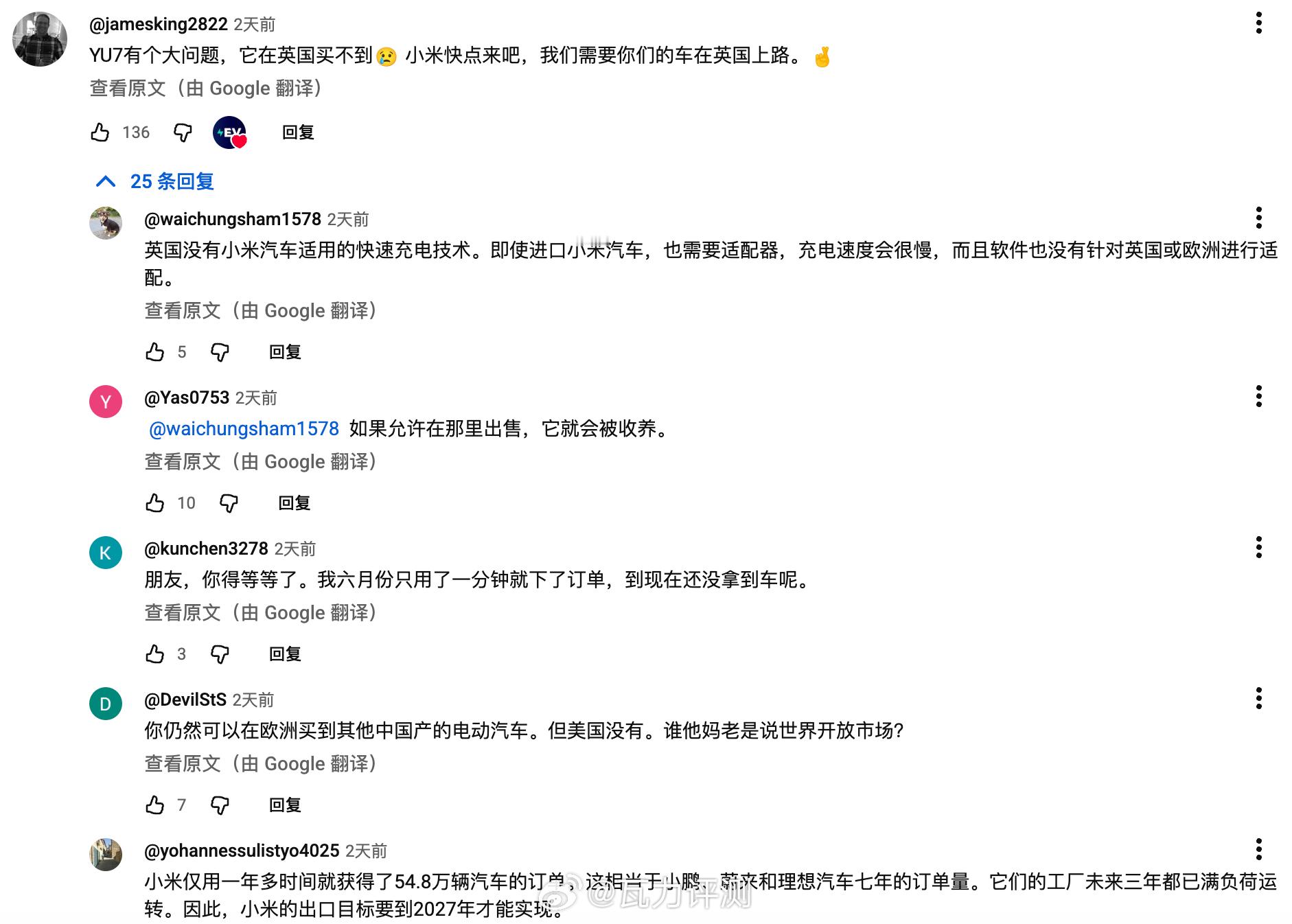 刚才我看不少人在转发下面图里的内容,其实这个事我间接说过很多次了。小米汽车在国外非常受欢迎,不管是youtube网民的评价,还是各种国外汽车网站的评论里,全都是赞美的用词。小米已经成了中国新能源的一张名片,并且是非常有名的名片。包括EV.com他们这种对电动车销售情况非常了解的专业平台,他们对小米汽车的实际体验和整车卖点都是直接可以用“吹爆了”来形容。如果换到国内某个媒体说,绝对会被人说“收了好多钱”。除了国内的某些人看不得小米好以外,其实小米这个品牌早就不是那个卖手机的小厂了,小米现在已经是全球知名的手机品牌,全球知名的汽车品牌。并且我感觉汽车这个名头在国外比手机要更响亮。不管是实际驾驶体验,还是在老外擅长的纽北,小米都用实际行动得到了他们的认可和称赞。还有一个让老外也无奈的地方,虽然中国的车很好,虽然他们很喜欢小米,但他们会担心自己的国家用关税大棒来保护他们自己已经落后的技术,他们不能以更合适的价格买到小米YU7和SU7。现在小米第50万辆车已经下线了,回想一下其它友商,是多长时间实现这个目标的? 小米汽车的成长速度在整个新能源历史上,可能都不会再有第二个品牌了。这需要实力、时间点、运气、国家的支持等,各种因素全都聚集在一起才能实现。还是那句话,你愿意买一辆虚空无敌的车,还是愿意买一辆踏踏实实测试,并且被人24小时循环攻击都没找到硬伤的车?