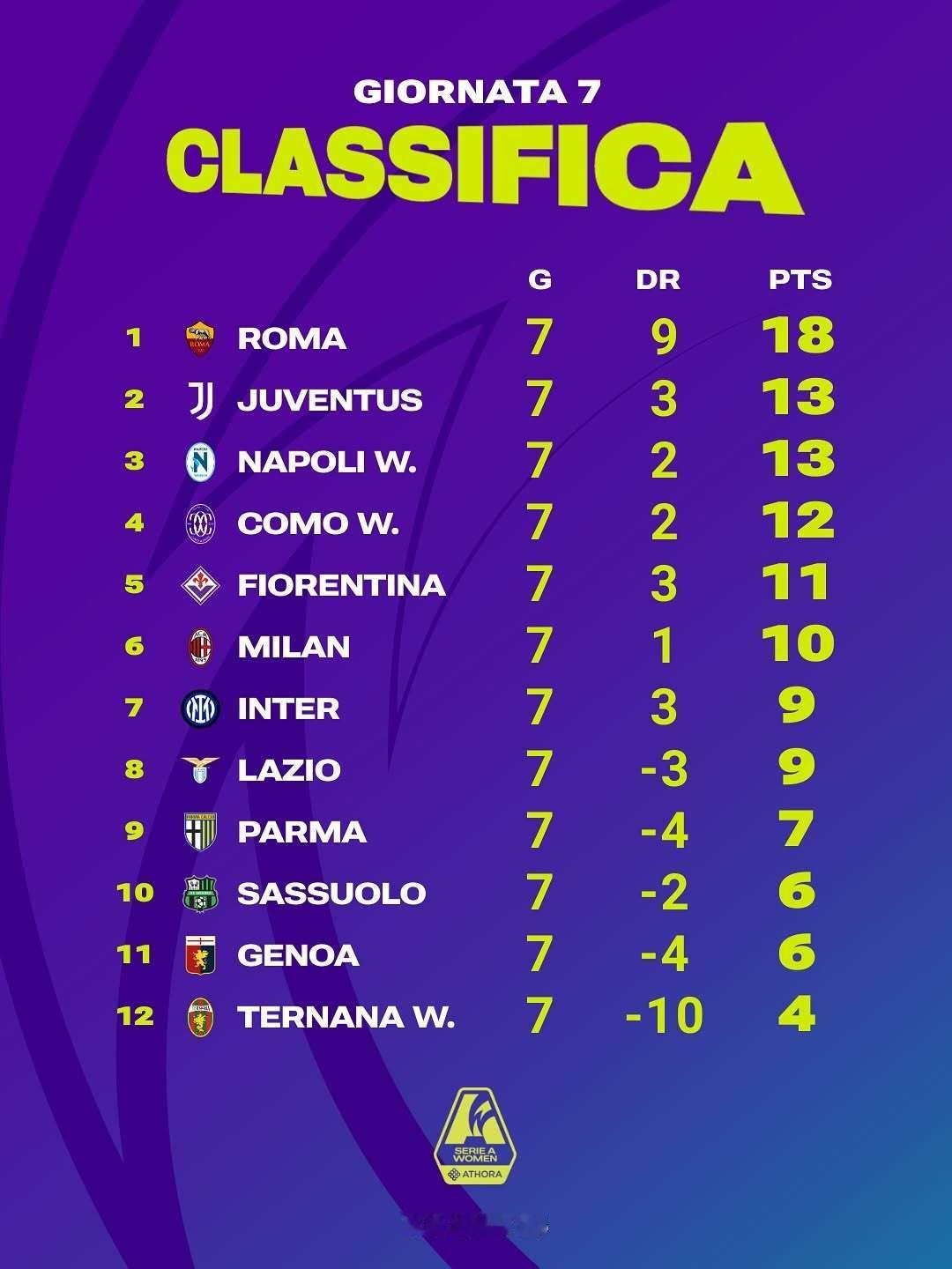 【女足积分榜】 2025-26赛季 女足联赛第七轮积分榜。💪🏻