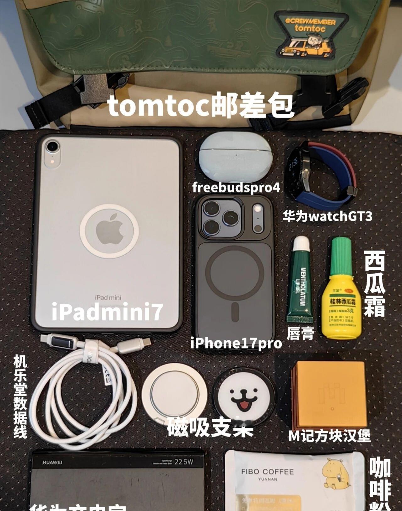 i 人日常 EDC|简单,但缺一不可今日出行翻包~ 🎒 tomtoc 邮差包 📱 iPhone17pro 💻 iPadmini 7 ⌚ 华为watchGT3 🎧 华为freebudspro4 🔌 机乐堂数据线 🧲 磁吸支架 🔋 华为充电宝 ☕ 咖啡粉 💊 西瓜霜 💄 唇膏