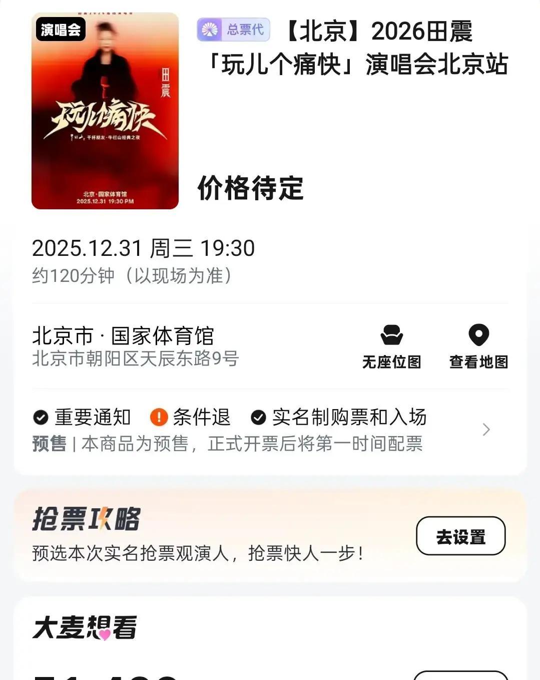 一觉睡醒 是不是全网都知道了。 12月31日,天后田震官宣复出,时隔24年再办个人演唱会。票价与档次未公布,官方平台显示,已有5.1万人标注“想看”。去年那英在澳门开唱,“想看”仅三千多人,演出前一天仍有余票。对比之下,田震的票房号召力更强。 刀郎走红后,“第二个刀郎”成热议。大家给出的标准是老牌实力派,复出即拥泼天流量。田震出道数十年,《野花》《执着》深入人心,嗓音厚实,现场稳。2001年颁奖风波后淡出,如今重启舞台,话题度直升。 从数据到情绪,田震的回归像一记强心针,或将带来怀旧热潮与现场复苏。网友炸锅,评论区“终于等到你”刷屏。接下来是巡演还是新专辑,大家都很期待。你觉得她会成为口碑与热度兼具的“第二个刀郎”吗?你会买票吗?