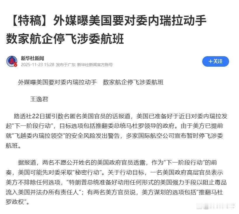 11月25日,据央视新闻直播间报道,昨天,哥伦比亚总统佩特罗表示,美国计划入侵委内瑞拉的真正目的原因是委内瑞拉石油,他希望找到和平解决委内瑞拉的政治方案,重申不支持入侵委内瑞拉。 哥伦比亚外交部长比利亚维西奥当天也表示,美国对委内瑞拉军事威胁加剧地区紧张局势,任何破坏委内瑞拉入侵行动,将导致大规模难民外流。 同时,巴西总统卢拉表示,他不希望美国对委内瑞拉进行“地面入侵”,愿在两国之间扮演调解人角色。 美国总统特朗普为了委内瑞拉石油天然气黄金,指控马杜罗领导一个贩毒集团苍白无力!那是美国编造入侵借口。 在此,想起了20多年前,时任美国国务院鲍威尔手里拿着一小瓶洗衣粉在美国国会上讲,这是在伊拉克发现大规模杀伤性武器。结果欺骗了美国国会及世界各国,多年后英国首相揭穿了当年骗局。 今天美国总统特朗普又老调重弹,采用欺骗方式制造谣言,对委内瑞拉入侵。 从目前看,美国入侵委内瑞拉进入到倒计时了!