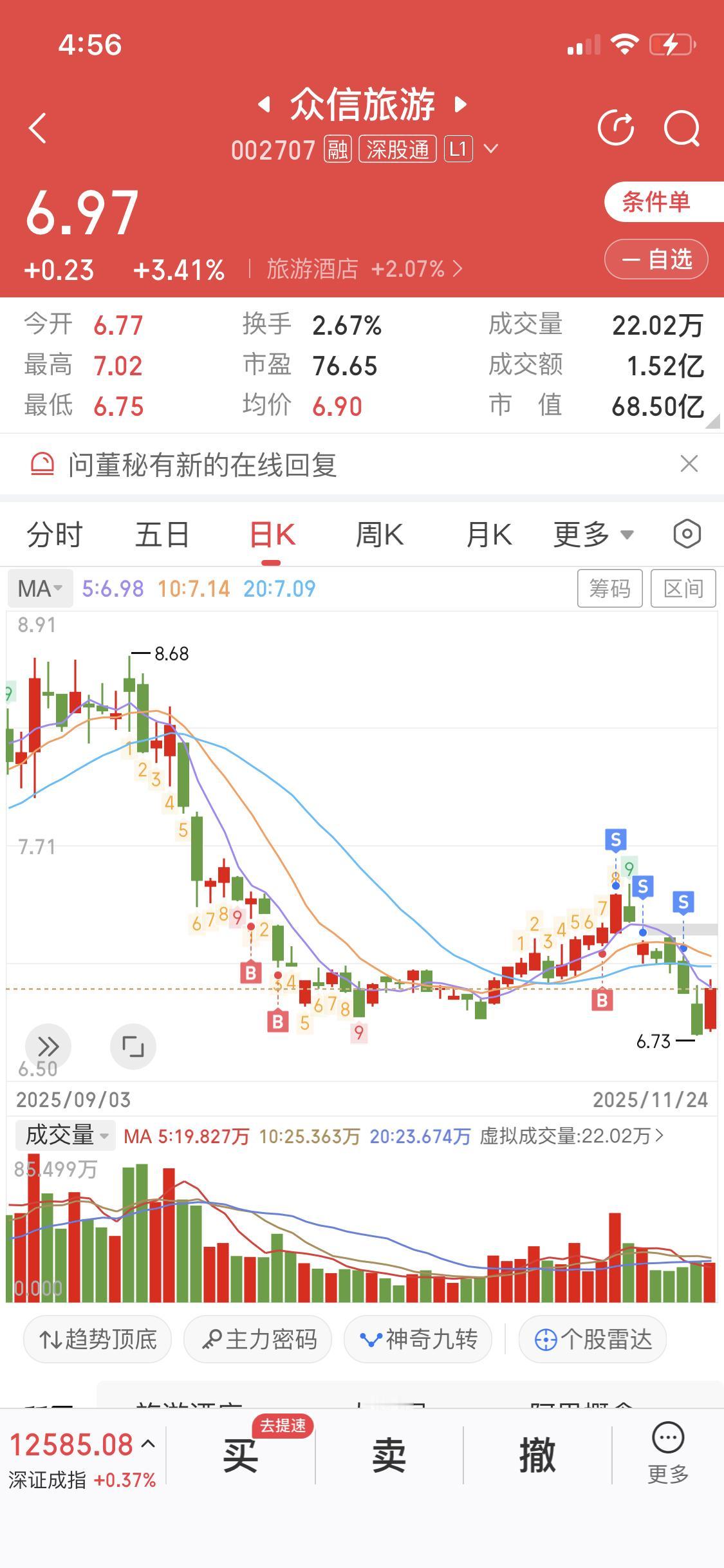 11月24日众信旅游有不少动态。在互动平台上,它表示极地邮轮中心持续深耕南北极旅游市场,是国际两大极地权威机构双认证会员,还是国内最大的极地邮轮产品运营商,市场占有率第一,产品秉持游客利益最大化理念,获市场好评。 从股价表现看,11月24日盘中上涨2.08%,截至13:15报6.88元/股,成交6349.54万元。主力资金净流入370.74万元。不过今年以来股价跌6.90%,近段时间走势也不太乐观。众信旅游主营业务涉及出境游批发、零售及整合营销服务,旅游批发占比超七成。