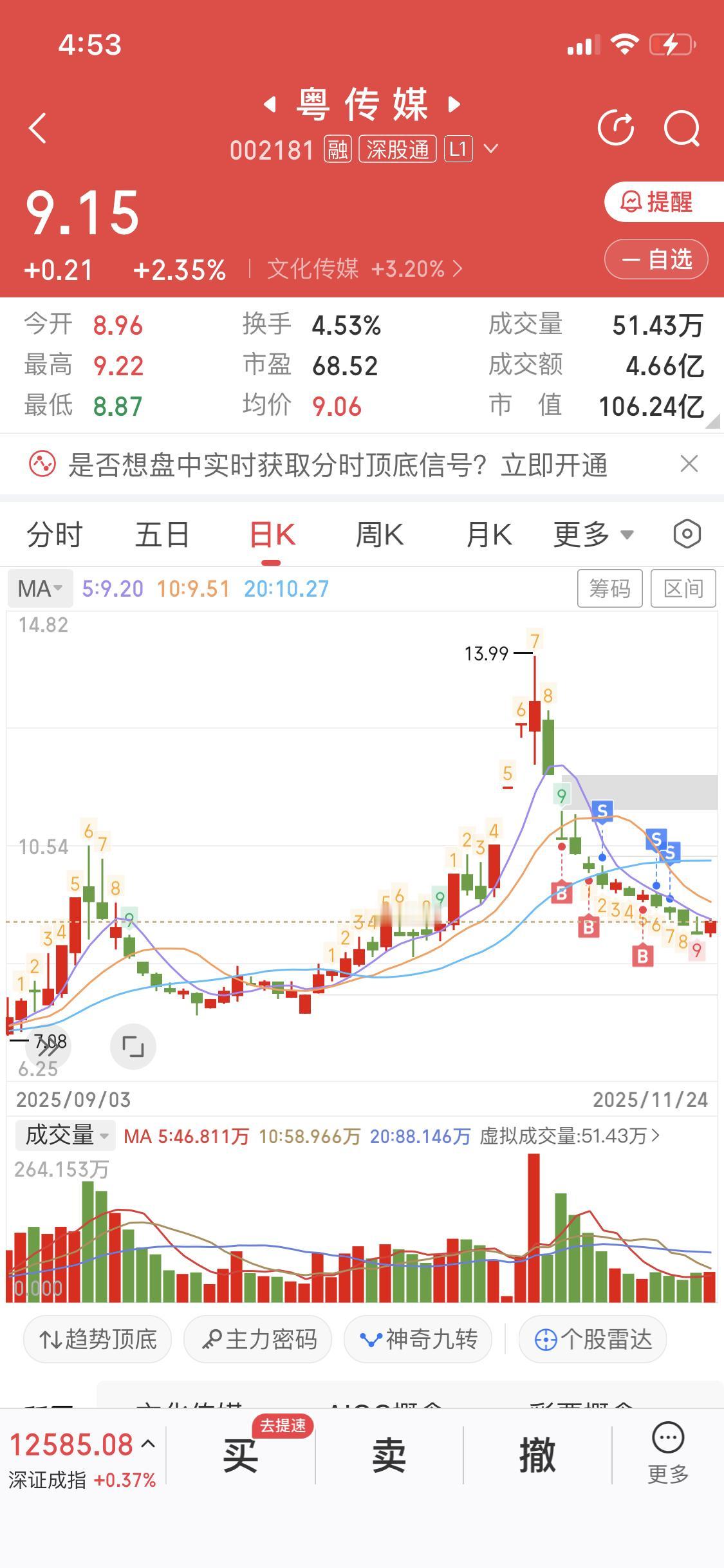 11月24日,粤传媒开始止跌回升,涨了2.35%,成交额达4.66亿元。这一表现还挺引人注目的。 粤传媒可是首家获中宣部和国家新闻出版总署批准并在主板上市的公司,也是A股首只通过IPO上市的报业股。它依托广州日报报业集团,业务涵盖广告、销售、印刷等多个领域。旗下子公司经营着《足球报》等体育资讯类报纸。 另外,广报G视频2023年上半年完成197个视频项目,微短剧《志》还入选优秀网络视听作品。这次止跌回升,或许意味着它在短剧游戏、文化传媒等概念加持下,能有更好发展。