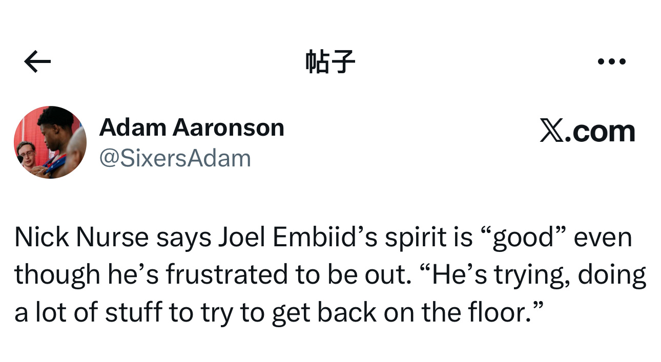 主教练尼克·纳斯采访时表示,乔尔·恩比德(右膝伤病管理)的状态仍为每日观察——“我们正在等待队医的上场许可,他今天参与了球队集训全过程。”尼克·纳斯还表示,尽管乔尔·恩比德因伤缺阵感到沮丧,但他的精神状态“很好”——“他正在积极尝试各种康复手段,为重返赛场全力以赴。”