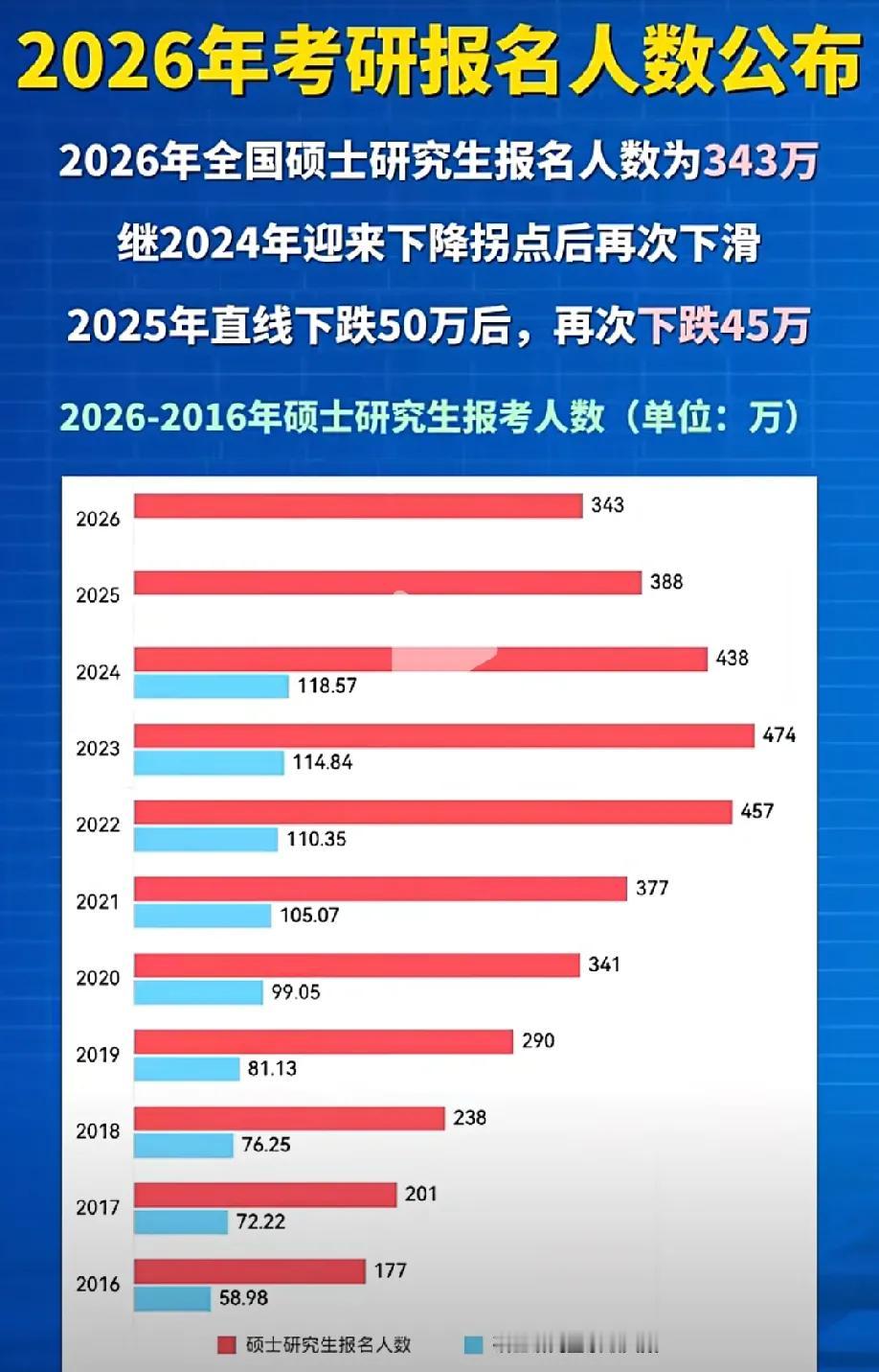 2026年全国硕士研究生报名人数为343万。考研报名总人数继2024年迎来下降拐点后再次下滑,2025年直线下跌50万后,再次下跌45万。