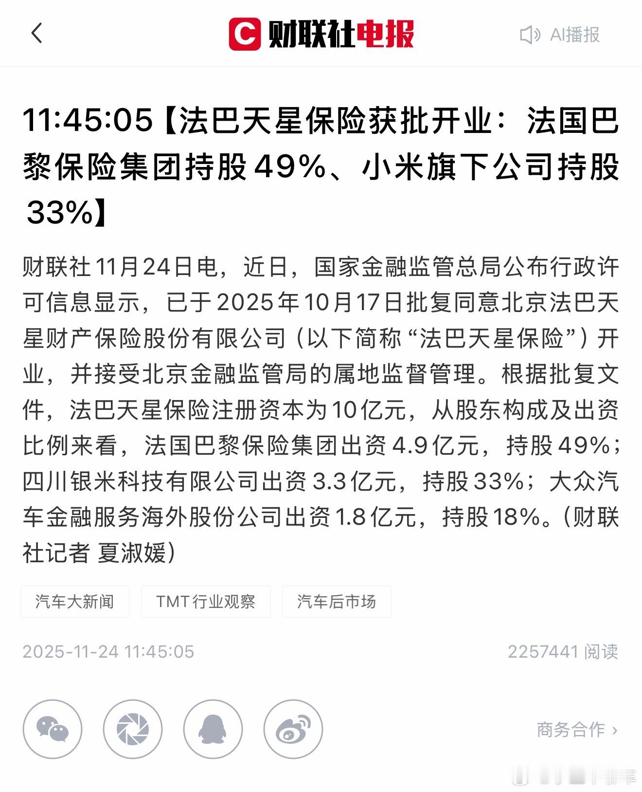 各位股东,车主早上好,雷总斥资超1亿港元增持本公司股份,小米入股的天星保险也被批