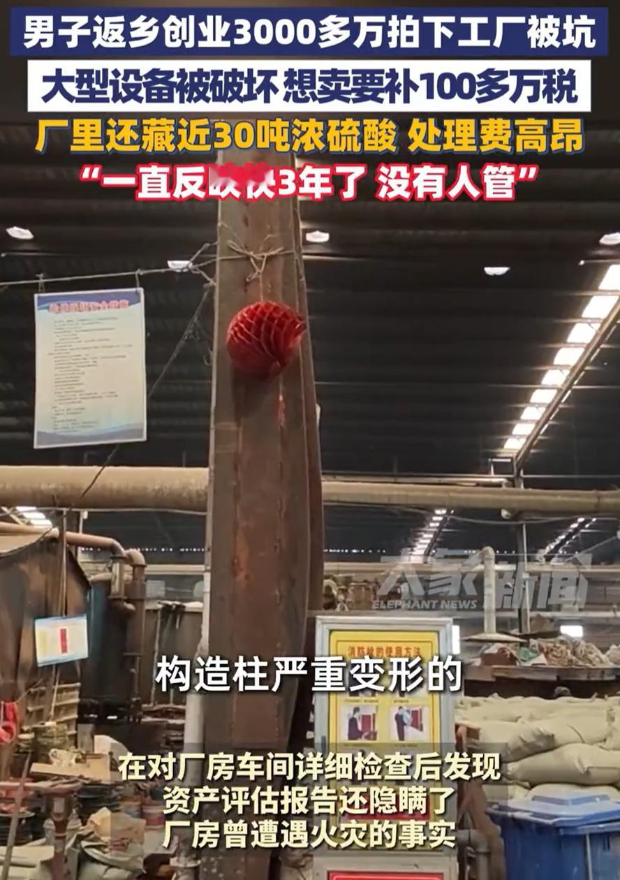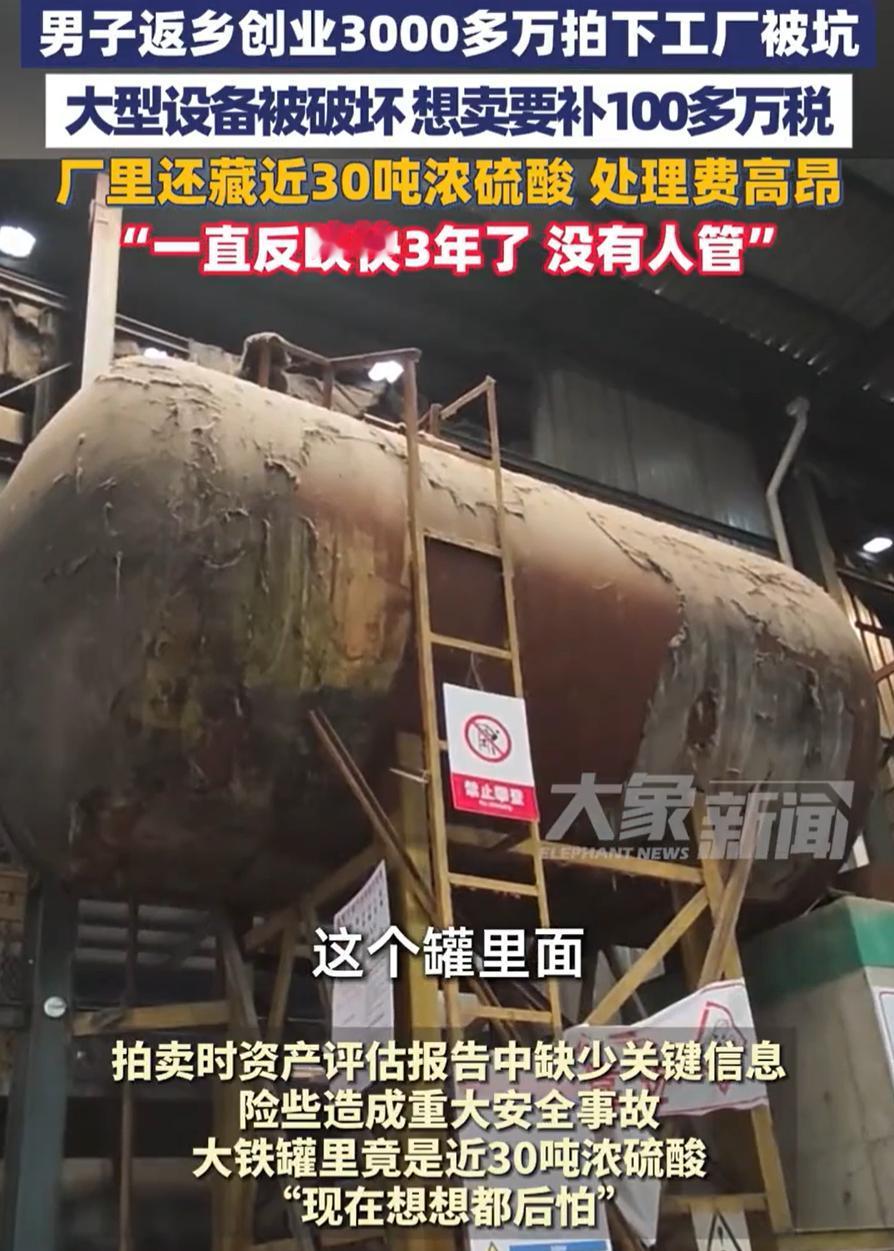 “这不是坑人嘛!”山东菏泽,男子返乡创业,花3000多万拍下了一家工厂,本想着接手后好好发展一下,结果付了钱却发现都是问题,评估报告显示设备都是好的,可走近一看才发现都成了废铁,工厂里还藏了20吨浓硫酸,处理费用那是相当高 据悉,关先生是一家公司的董事长,事业上还算成功,但他一直有个想法,就是返乡创业,刚好看中了当地一家破产铝业公司的拍卖信息。评估报告上写得明明白白,设备齐全,资产总价值四千多万。他抱着期待,拿出三千多万竞拍成功 可钱付清了,问题却一个接一个冒出来 厂门口都进不去,租户不让看,只能隔着门缝瞄一眼,等真正交接时问题一下子全暴露了。评估报告里价值十几二十万的设备,到了现场不是断线缺件,就是干脆成了一堆废铁。喷涂线没了设备,航吊多年没检修还被切割,冷水机里空得能养鸽子。更糟糕的是,这些报废机器在税务上还得补税,关先生估算得多掏一百多万 这还不止,工厂里一个标着“报废”的硫酸罐,里面竟藏着二十多吨浓硫酸。车间水槽里还有几百吨硫酸废水。这些都是评估报告上只字未提的。浓硫酸是危险化学品 他们还发现厂房曾经历大火,钢结构车间的承重柱已经弯曲变形。修复这样的车间,比重建还费钱 面对这些问题,关先生找了破产管理人,也找了法院。法院的回应是:这不是司法拍卖,是破产管理人自主进行的拍卖,与法院没有直接关系 从关先生的描述来看,这个事让人有一种说不出的无力。返乡创业本来就是一条不容易的路,大家愿意回家折腾,是希望能把点子落地,让家里也跟着热起来。可明明花了大价钱买公开拍卖的资产,却连最基本的透明度都保证不了 我觉得这事的关键不在设备是不是旧,也不在厂子有没有问题,而在信息对不对等。如果评估报告把真实情况写出来,买不买是别人自己的决定。创业的人最怕的不是难,是摸着石头结果发现河底有坑 这也给我们提了个醒,大宗交易务必谨慎,尽可能突破障碍进行实地核查,同时对评估报告保持审慎态度,纸面上的数字和现实状况,有时天差地别