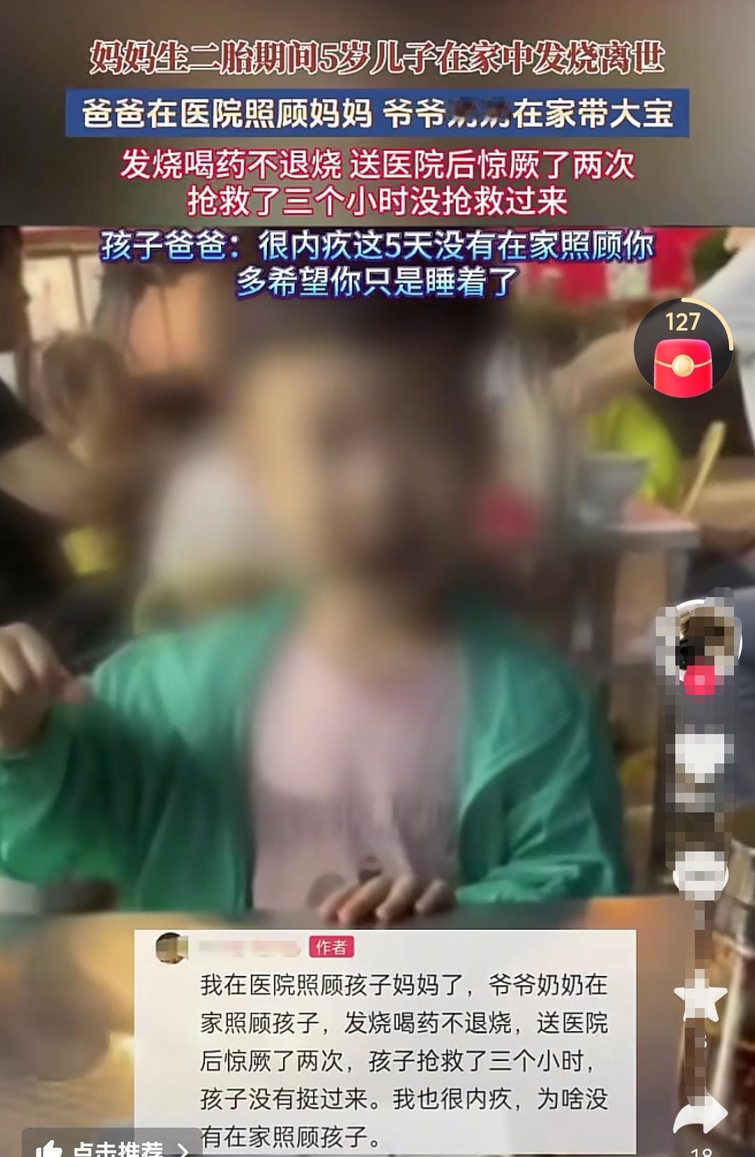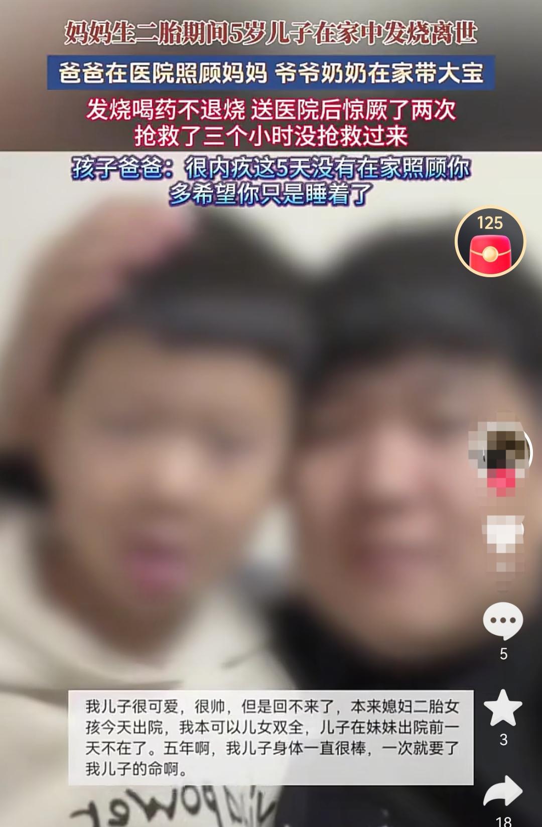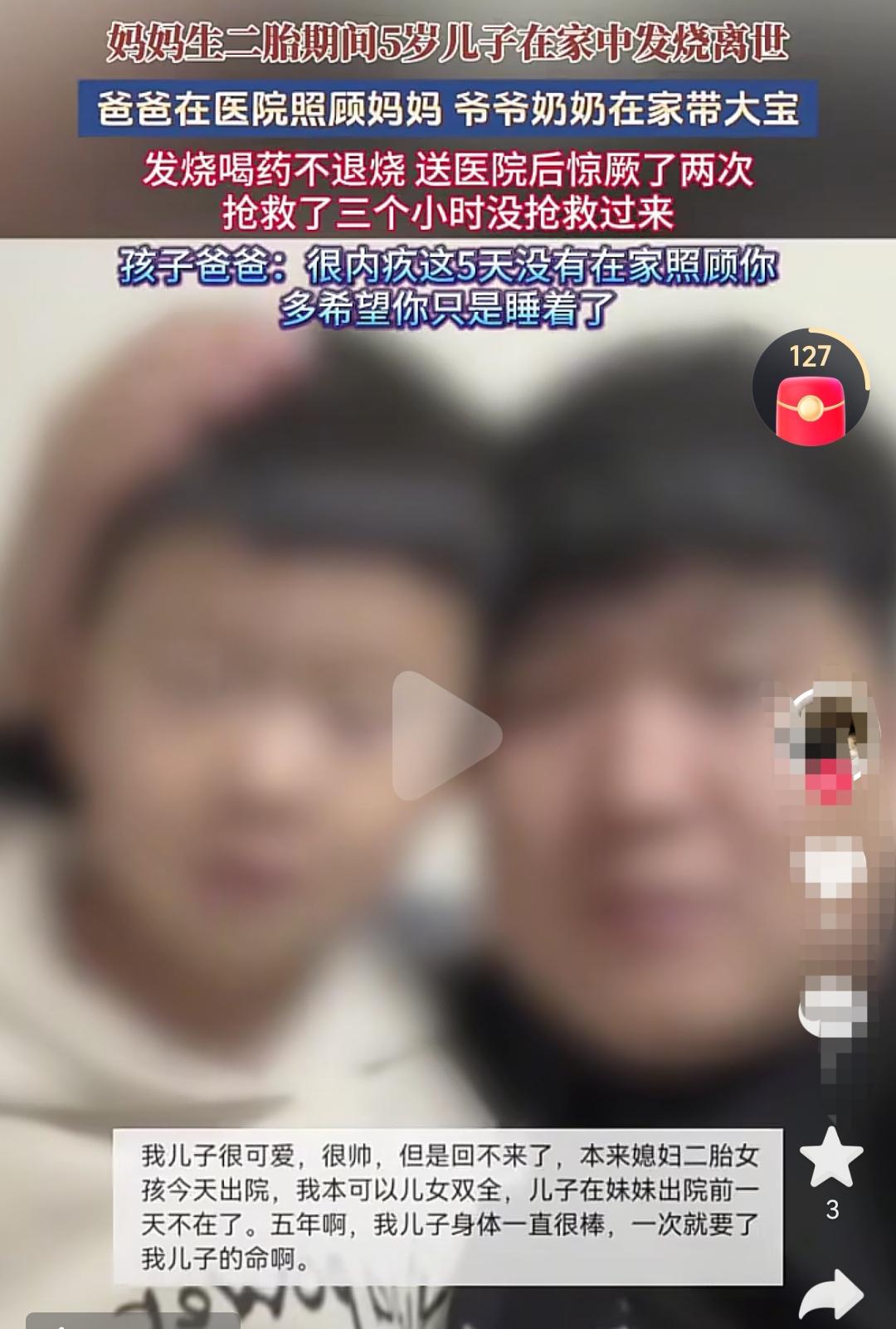 唉,闺女的生日成了儿子的忌日,不知道大家看没看这个视频。 妈妈生二胎期间,爸爸在医院照顾妈妈和闺女,5岁儿子在家中发烧,爷爷奶奶在家照顾,喝药后没有退烧,送医院后连续惊厥两次,抢救了三个小时没抢救过来,最终离世。 看到网友的评论,有埋怨公婆的,有埋怨爸妈的,有怒斥为什么要生二胎的等等等。 我知道所有的妈妈都看不了这个画面,我们谁也不知道这次的甲流这么厉害,就像新冠一样。如果是普通感冒不会这样的,谁都不想这样,不要怨恨老人照顾不好,也不要怨恨孩子父母怎么不在身边陪着,他的爷爷奶奶爸爸妈妈一辈子都会生活在自责中。