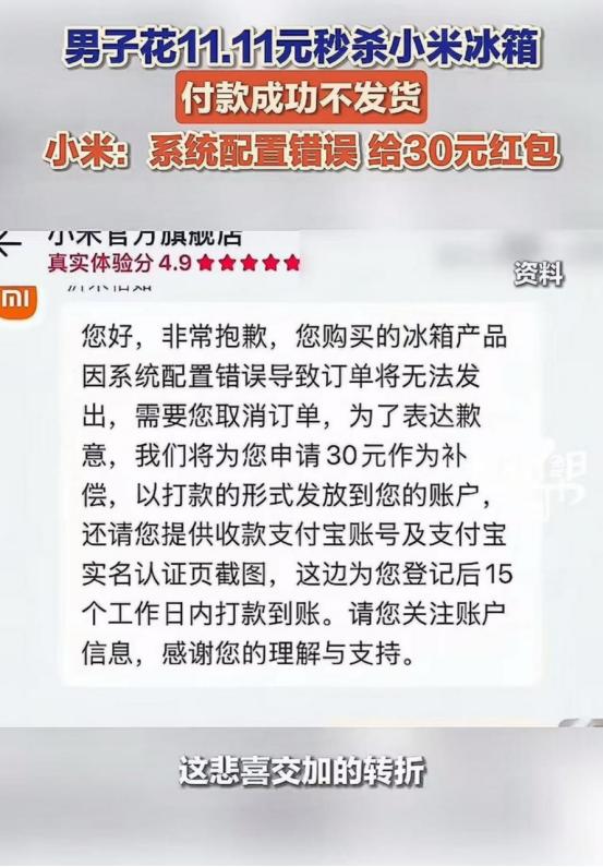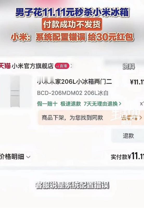 “毫无契约精神!”11月23日,河南,男子花 11.11 元秒杀小米冰箱,付款成功后不发货。店铺:系统配置错误,给你 30 元红包!男子:把我当要饭的? 最近,双十一的购物潮还没过去,就有不少网友讨论起网购踩坑的事。其中张先生(化姓)遇到的情况,让人看完既生气又觉得无奈。 双十一期间,他看中一款小米冰箱,平时原价要1499元,就算搞促销也得799元。而此时,官方旗舰店刚好有场秒杀活动,标注的价格只要11.11元。 为了能抢到这个优惠,张先生连续好几天都守在手机前等着活动开始。结果功夫不负有心人,他真的成功付了11.11元,订单也显示付款完成。 本以为等着收货就行,可没过多久,一条短信让他傻了眼。商家直接把订单取消了,连个提前沟通的电话都没有。 无独有偶,浙江的罗女士(化姓)也碰到了一模一样的事。11月14号晚上,她也在这场秒杀活动里抢到了同款冰箱,当时配送方还明确告诉她“第二天就能送到”。 结果等到的不是送货上门的电话,而是系统发来的“订单无法发出”的通知,理由和张先生收到的一样,都是“系统配置错误”。 原来,这样的事件并非个例。还有不少消费者都抢到了却没收到货,再去看平台上的商品,已经悄悄下架了。 面对这么多消费者的质疑,小米官方客服终于有了回应,说之所以发不了货,是库存或者价格设置出了问题,还给出了补偿方案:给每个消费者发 30 元红包,但前提是得自己主动取消订单。 至于大家追问的“为什么订单都生成了才发现问题”,客服再也没给出更具体的说法,对于消费者提出的“按订单发货”或者“提高补偿”的要求,也直接拒绝了。 电商平台这边的态度也让人摸不着头脑。工作人员说,平台会对不发货的商家进行处罚。可话锋一转,又说:“这个订单价格太低,商家可能宁愿接受处罚也不发货”,还劝消费者“不如接受30元补偿,省得费时费力维权”。 这种说法一出来,网友们都不买账。这种“息事宁人”的态度根本就不是在解决问题,也没有真正把消费者权益放在首位。 正如张先生所说:“系统出错又不是消费者的错,凭什么要让我们承担后果?30 元红包看着像那么回事,可跟原价近1500元的冰箱比起来,简直是杯水车薪,说难听点,这不是把人当要饭的打发吗?” 网上对这事的看法也分成了两派。支持消费者的人觉得,既然是商家自己搞的秒杀活动,就得有契约精神,不能因为自己出错了,就把损失转嫁给消费者。 但也有一部分人理解商家。觉得11.11元买一台冰箱,明显超出了正常的促销范围,能给30元补偿已经算有歉意了,消费者也别揪着不放。对此,你有什么看法?欢迎在评论区留言讨论。双十一 消费者权益 信息来源: 红星新闻2025-11-23|男子11.11元秒杀小米冰箱遭拒发,客服回应:系统配置错误,补偿30元!网购平台解释 文|墨海 编辑|史叔