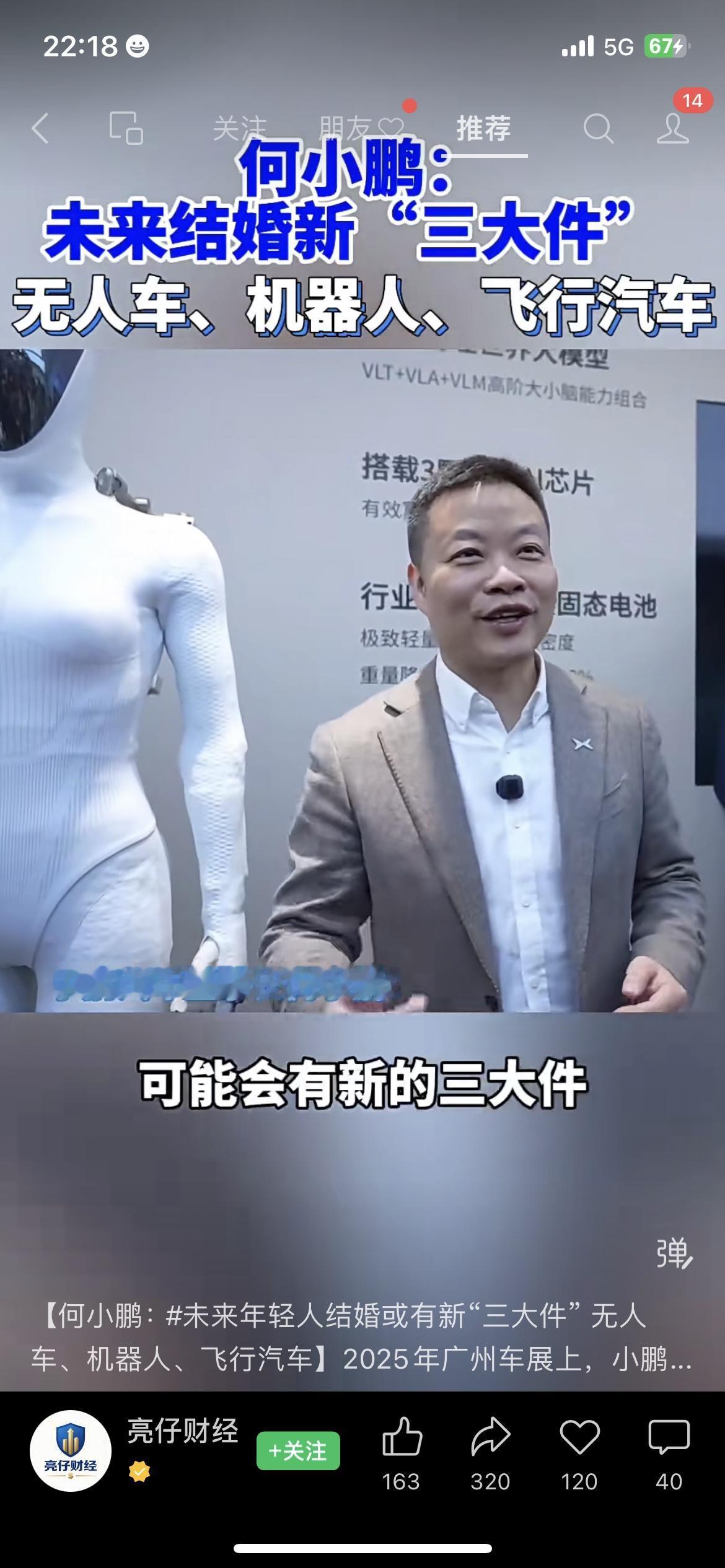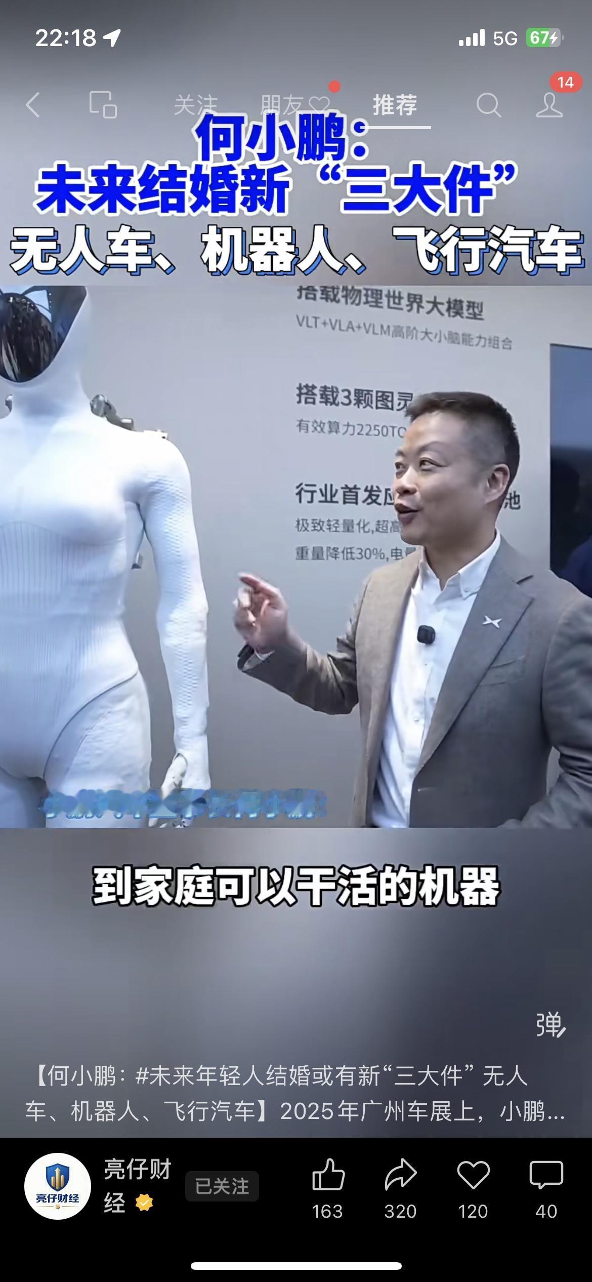 何小鹏:未来结婚“三大件”是无人车、机器人、飞行汽车? 广州车展上何小鹏的话可太敢说了——说未来年轻人结婚,新“三大件”不是房和车,是无人车、家庭机器人、飞行汽车。 他说的机器人还不是花架子,是能在家干活的那种。现在车企都在卷科技,你们觉得这“新三大件”真能取代传统彩礼?十年后结婚,你会想要这三样不?何小鹏p7