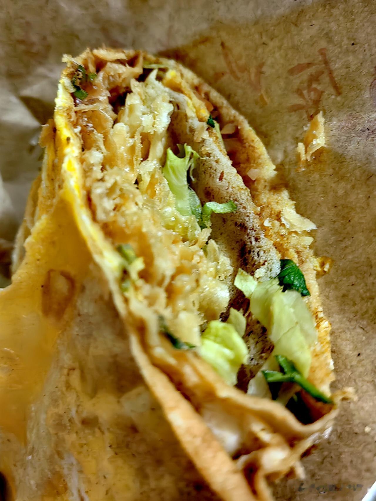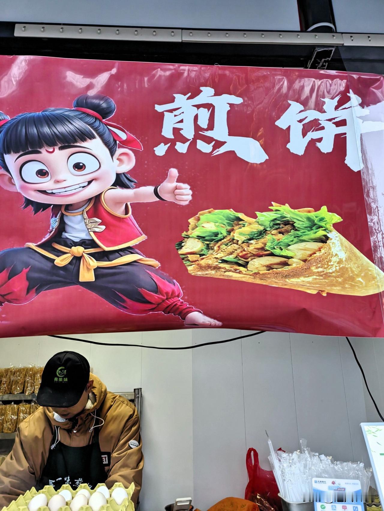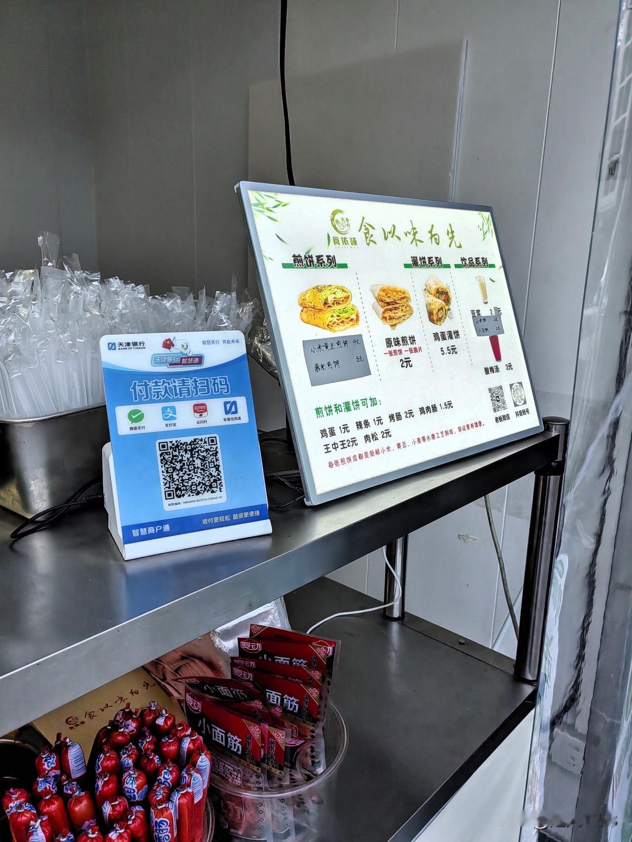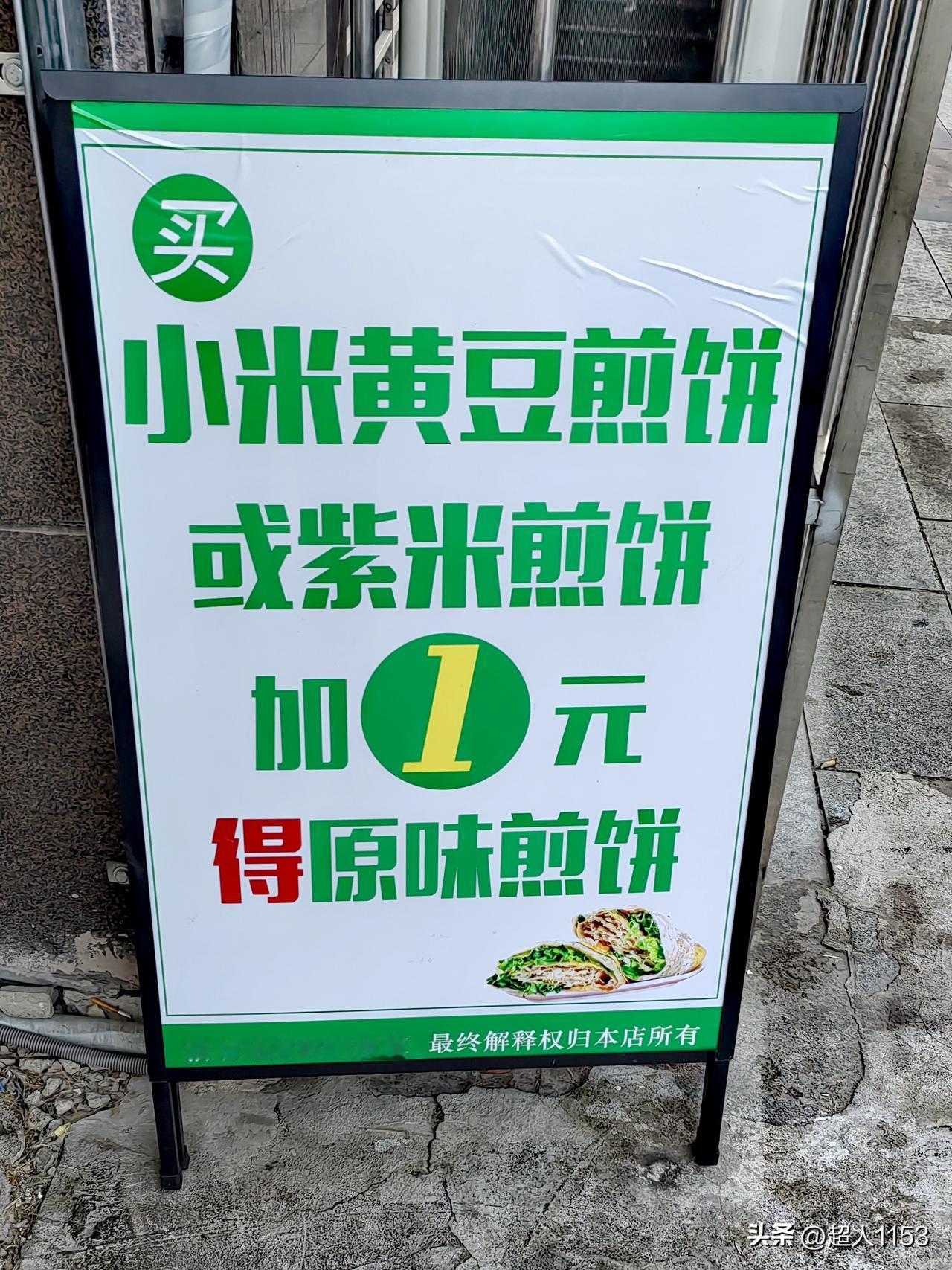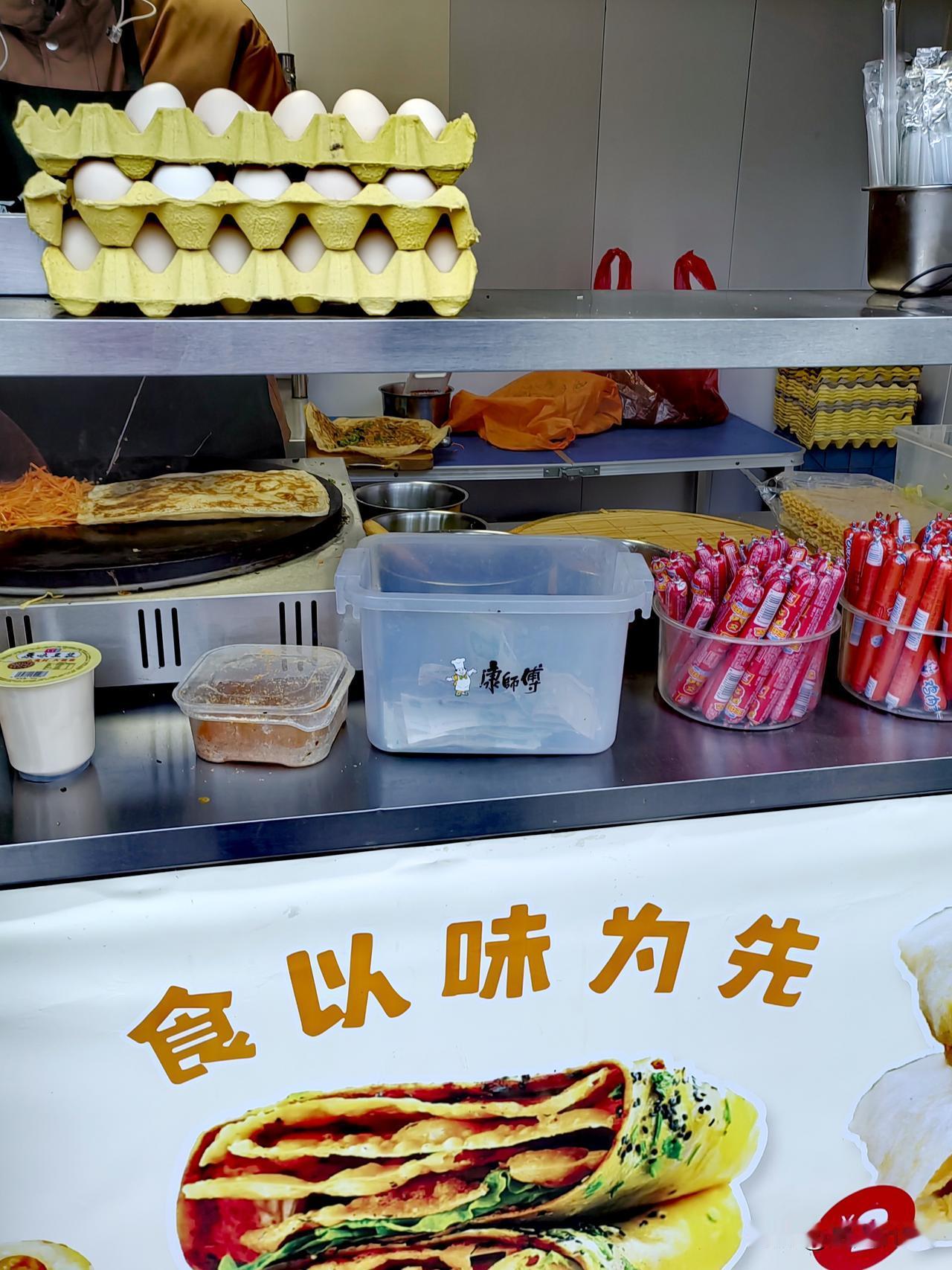 一大早楼下的喇叭就开始循环的喊了,煎饼店开业优惠了,每套煎饼3元,再加1元可得原味煎饼一张。 早晨老公说想吃煎饼果子,原来我们都是在金建街健饼连锁店去买。它们家是6元一套,也是放一个笨鸡蛋,味道是真心的不错! 今天我拿了2个乌鸡蛋下楼摊吧,新开的这家煎饼店,就在楼下。哈哈民以食为天,它家叫食以味为。 煎饼有小米黄豆面、紫米面,有鸡蛋灌饼,烤肠、豆浆、还是挺全的。 就近了在它家尝试一下吧,买了一个小米黄豆煎饼三元一套。里边放的是一个普通的鸡蛋,生菜、面酱、葱花、香菜,我没让放辣酱。加上从家拿的两个乌鸡蛋,摊了一份分开,我和老公一人一半。 我做了一下比较,虽然他们家比健饼店便宜,但是它家的煎饼是预制的,而且不是笨鸡蛋。脆片儿都一样,也是成袋配送的,口感吃着差不多。 老公说我们还是多走几步,去健饼店买吧。面饼还是现摊的好吃,还卫生。友你们说对吧,吃的还是要注意卫生和食品安全。