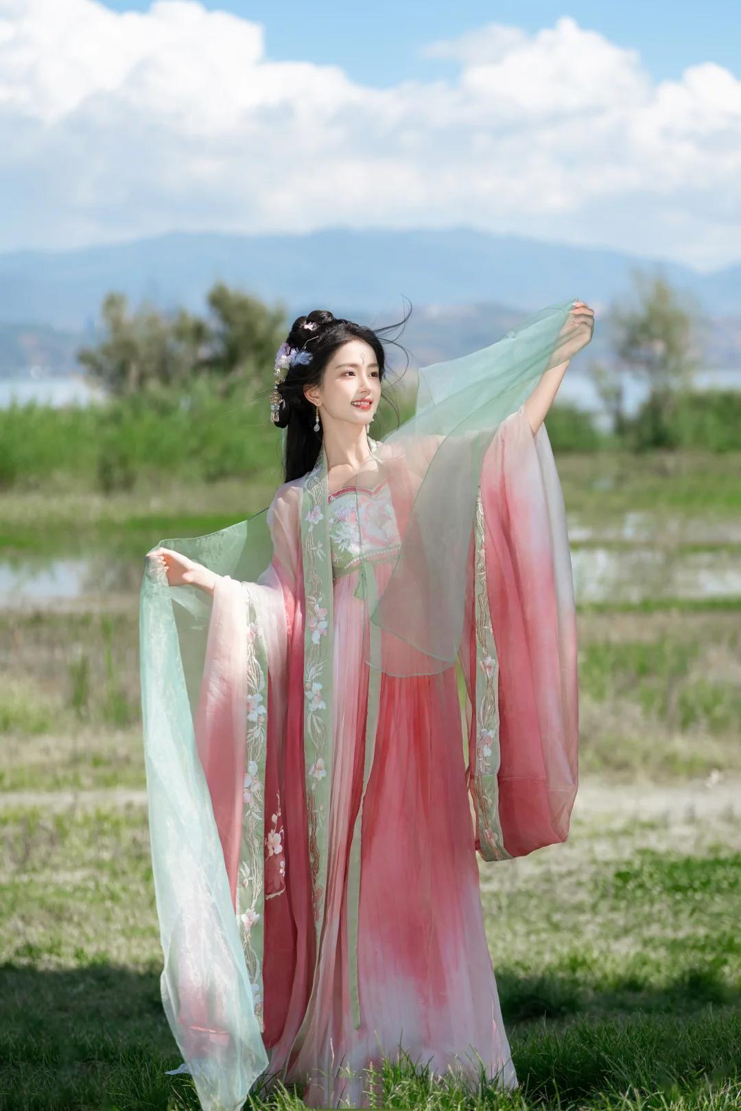 海天霞|齐胸襦裙穿出东方微醺感🌺 🌸薄纱披帛+垂坠襦裙=仙女奔跑自由!