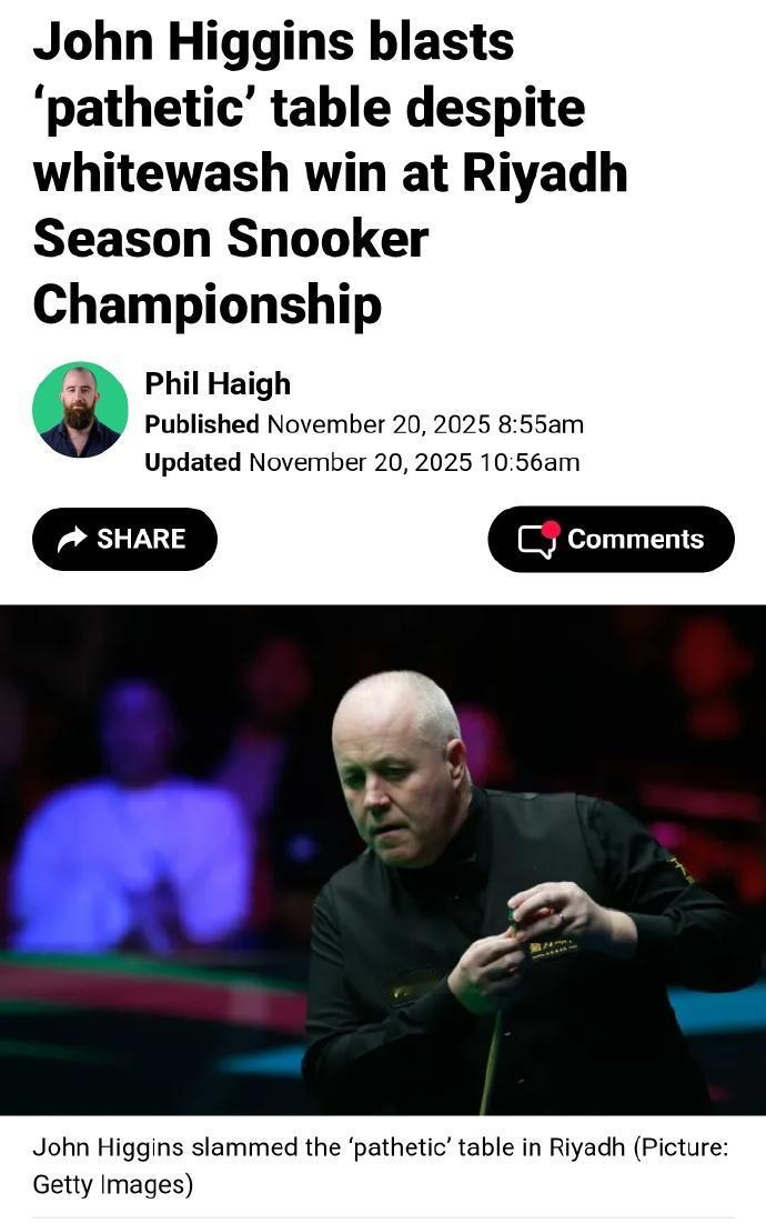 斯诺克:希金斯炮轰利雅得锦标赛 此前在利雅得锦标赛战胜丁俊晖后,希金斯猛烈抨击赛事球台状况。 他抱怨球台疑似被垫高,对于像他这样身高的选手极不友好,导致其难以控制白球,缺乏“抓球感”。他直言在如此高规格的百万英镑赛事中出现这种情况“令人悲哀”,并质疑官方验收标准,认为必须有人为此负责。 "开局确实有些艰难,"希金斯在TNT体育台表示,"我和丁俊晖都明显受到球台影响。前两局根本找不到抓球感。由于我俩身高都只有1米75左右,对这张球台确实束手无策——感觉就像桌脚垫了啤酒杯垫那样被抬高了。" "开局确实有些艰难,"希金斯在TNT体育台表示,"我和丁俊晖都明显受到球台影响。前两局根本找不到抓球感。由于我俩身高都只有1米75左右,对这张球台确实束手无策——感觉就像桌脚垫了啤酒杯垫那样被抬高了。" "必须有人对此负责。我不清楚验收人员是谁,但这对百万英镑级别的赛事来说简直荒唐。世界斯诺克巡回赛必须立即处理这个问题。" 七届世锦赛冠军斯蒂芬·亨特利在解说席补充道:"我原本以为这是球台设计特色。经约翰指出后才惊觉垫高幅度如此夸张。只能推测是地面不平整导致被迫垫高球台,但球员确实能明显感知。" 世界斯诺克巡回赛随即发表声明否认球台高度问题:"经测量从地面到库边顶部的尺寸,该球台完全符合WPBSA斯诺克官方规则标准。赛前已进行全面质量检测,赛事总监赛后也向约翰证实了这一点,证明所有桌腿都在规定公差范围内。我们顶尖的制台师始终致力于优化比赛条件,其工作表现有目共睹。" 对于"抓球感"问题,希金斯解释道:"完全没有抓球力。我想打定杆却总变成推杆,根本控制不住白球。或许其他球员能适应吧。"