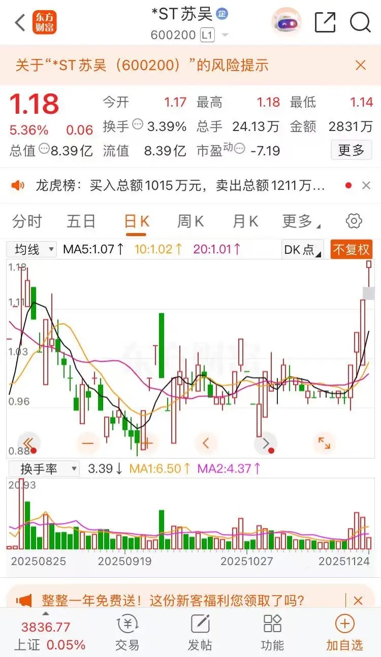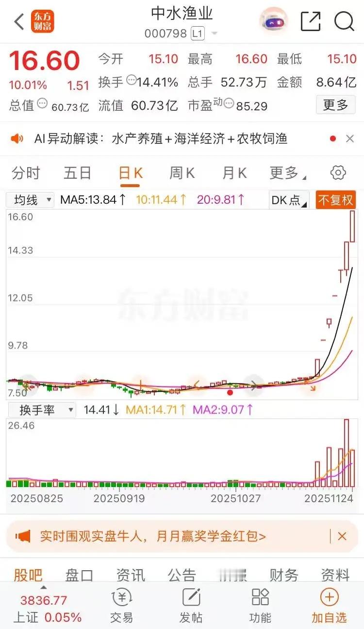 中水渔业和*ST苏吴中水渔业7连板涨停收盘报收16.60元每股,成交金额8.64亿元,总市值60.73亿元,这次估计会突破100亿元。*ST苏吴涨停收盘报收1.18元每股,成交金额2831万元,总市值8.39亿元,今天发提示退市提示公告,富贵险中求,如果摆脱退市风险,它就是最靓的仔。