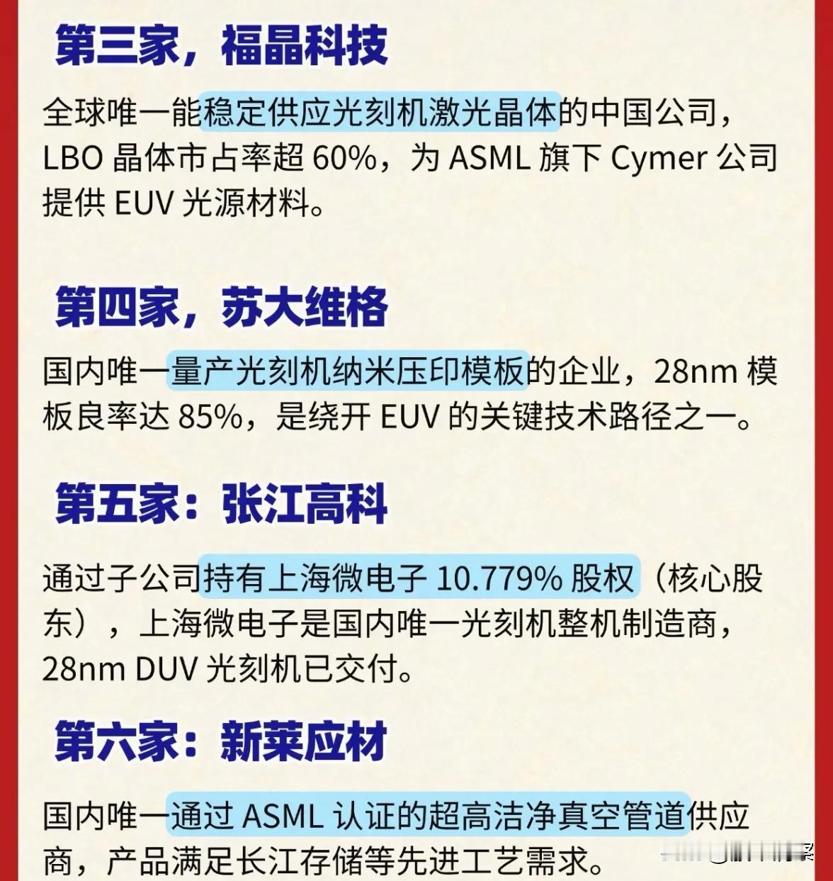 国产光刻产业链崛起,九大核心企业突破“卡脖子”环节 在半导体制造的核心环节——光刻技术领域,国内产业链正逐步实现关键设备与材料的自主突破。目前,多个细分板块已涌现出具备“唯一性”技术能力的企业,逐步打破海外垄断,推动国产替代进程深入发展。 在光刻胶领域,国内已有企业实现ArF光刻胶的量产,并进入主流晶圆厂供应链,产品良率表现优异。光学系统方面,具备光刻机投影物镜自主研发能力的企业已实现28nm级镜头验证,成像精度达到先进水平。上游核心材料中,激光晶体、纳米压印模板等关键材料也实现稳定供应,部分产品在全球市场占据重要份额,甚至成为国际光刻机巨头的供应商。在整机集成环节,国内唯一的光刻机整机制造商已实现28nm DUV设备交付,产业链协同效应逐步显现。此外,在超高洁净管道、碳化硅基座、光学组件及CMP设备等配套领域,多家企业通过国际认证或实现量产,填补了国内空白。 从市场情绪看,光刻产业链作为半导体自主可控的核心环节,长期受到高度关注。在政策支持与技术积累的双重驱动下,相关概念持续保持高热度和强预期。尽管短期受外部环境与行业周期影响可能存在波动,但中长期来看,随着国产化进程持续推进与技术迭代,具备核心技术和量产能力的企业有望持续受益。未来,产业链各环节的协同创新与生态整合将成为关键,在成熟制程巩固与先进制程探索中,国产光刻技术有望逐步实现从“点”的突破到“面”的拓展,为中国半导体产业筑牢制造根基。 光刻 芯片 光通信 CPO 股票交流 股市点评