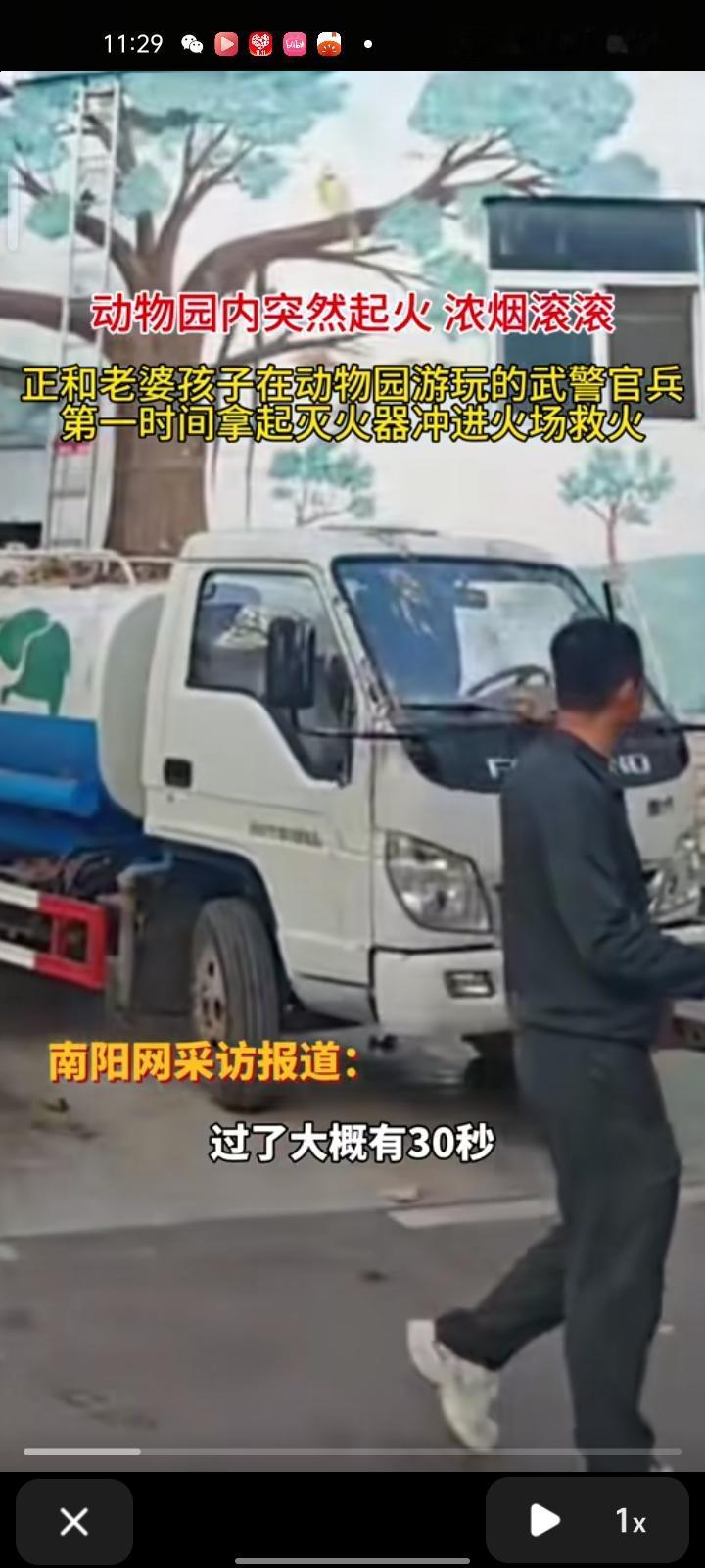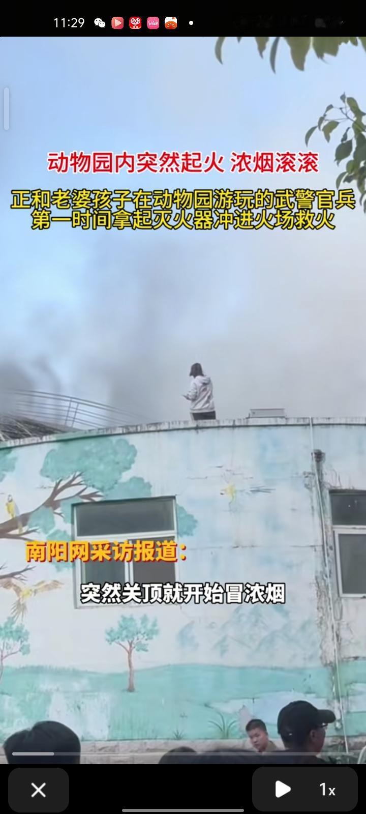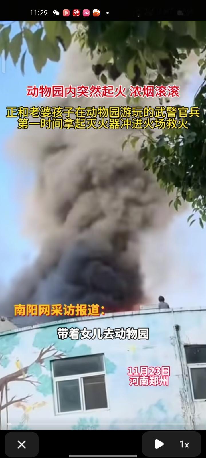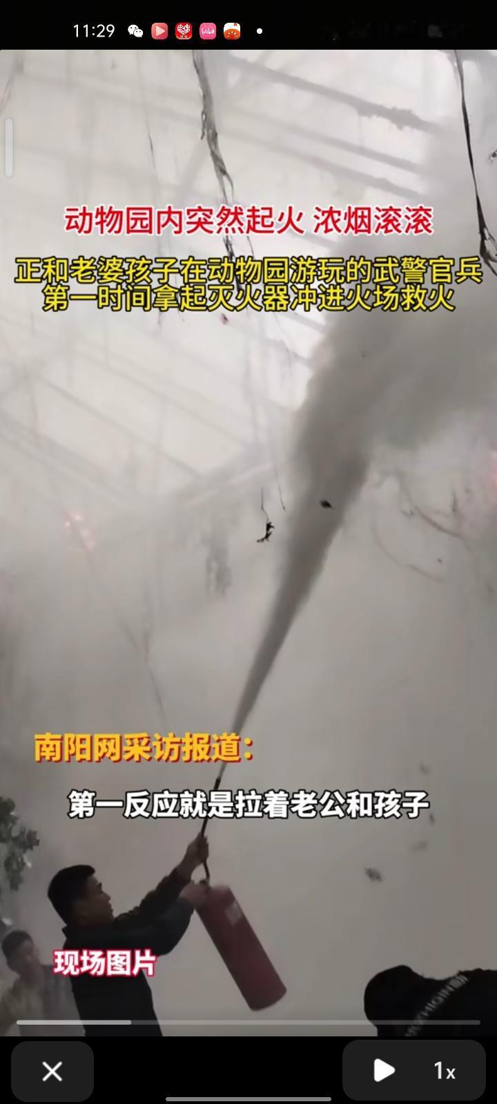 11月23日,河南郑州。一家三口刚逛完动物园,发现动物园突然起火,浓烟滚滚,身为武警官兵的丈夫第一时间拿着灭火器冲进火场救火,没有任何防护措施。妻子表示,老公既是组织者又是参与者,他很有胆识和经验,出来的时候头发鞋子全是湿的,浓烟和干粉给他呛得一直咳嗽,为武警河南总队郑州支队培养出这么优秀的官兵感到骄傲。