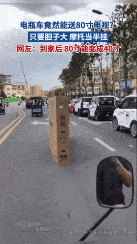 这是“牛拖地”, 路人还以为是真的呢,感觉单手骑车拖电视,轻而易举! 这也太夸张了? 难道现在的电视跟纸糊的,这么轻吗? 你就没仔细看,未开箱的一般有4、5根扎带,这就剩2根。 箱体的卡扣也是不完整,毋庸置疑,就是一个空纸盒!