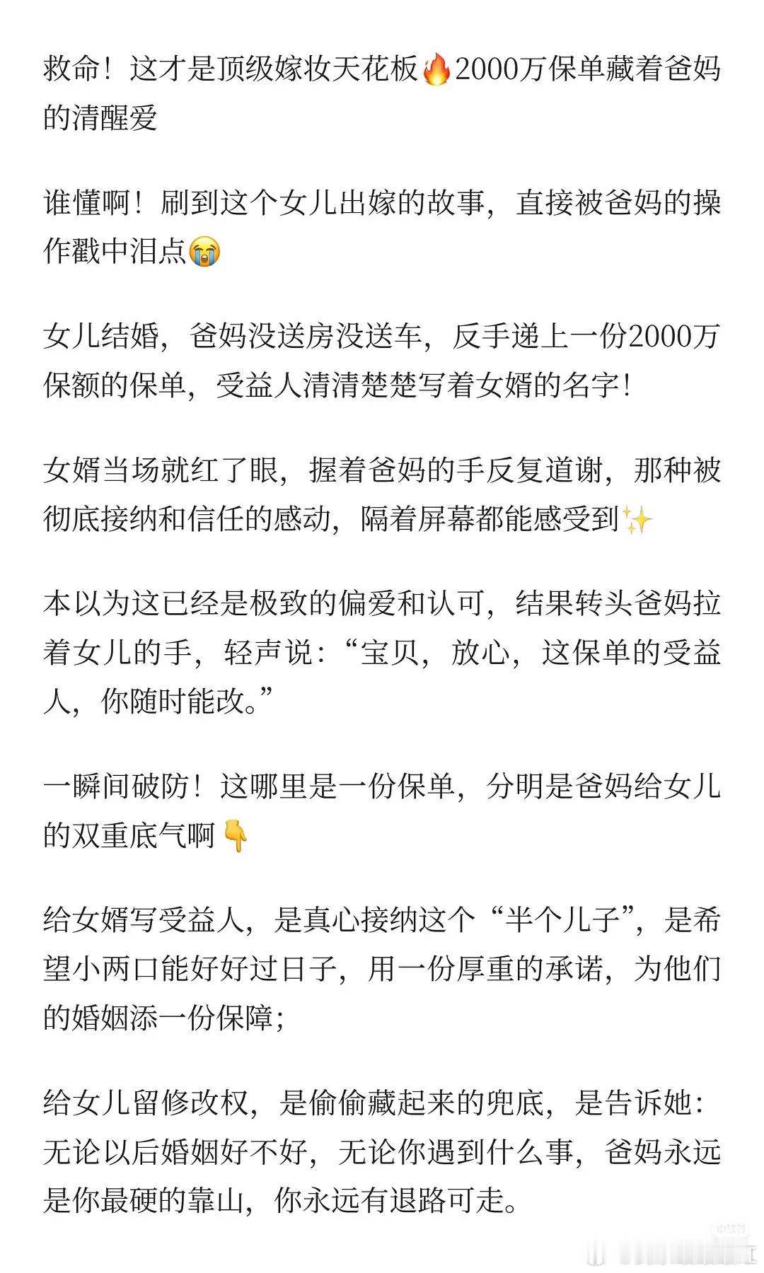 给女儿2000万保单做嫁妆,受益人写女婿,这是什么人间清醒。。。。恐怖片吧这是