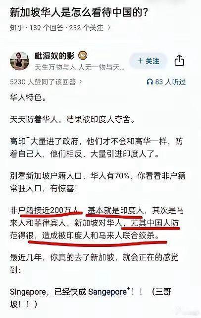 新加坡的终极归属是三哥坡!? 不知道星国后背有没有影子政府,这影子政府有没有“以印代华”是国策? 盎撒对于一些自己守不住一些地方,总会引入印度人。比如新加坡,澳大利亚,加拿大,都是如此。 在国民如此反对的情况下,这些政客依然孜孜不倦的执行,从这个视角就可以看出,背后确实有影武者,所以,不管谁上台,都必须执行。 Singapore,不是Sangepore的通假字吧?? Source: Zhihu