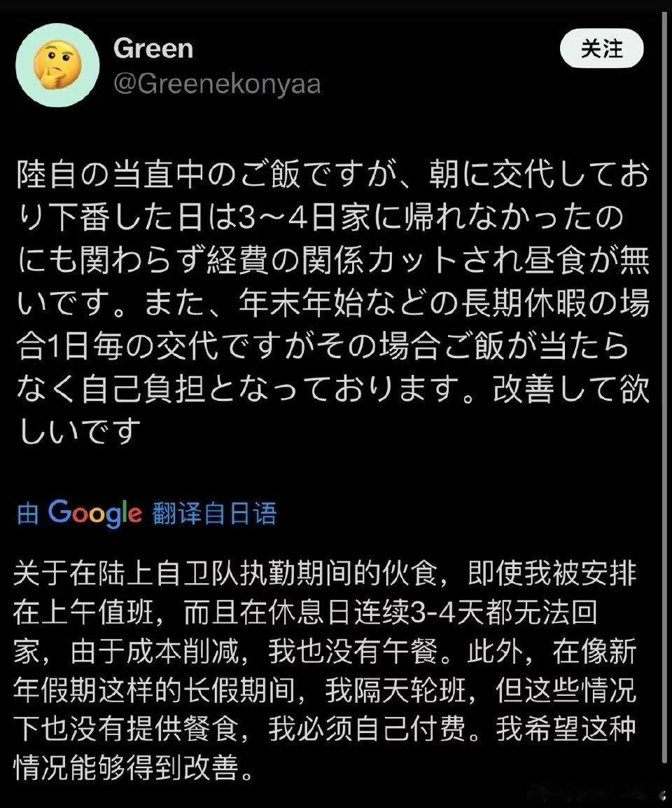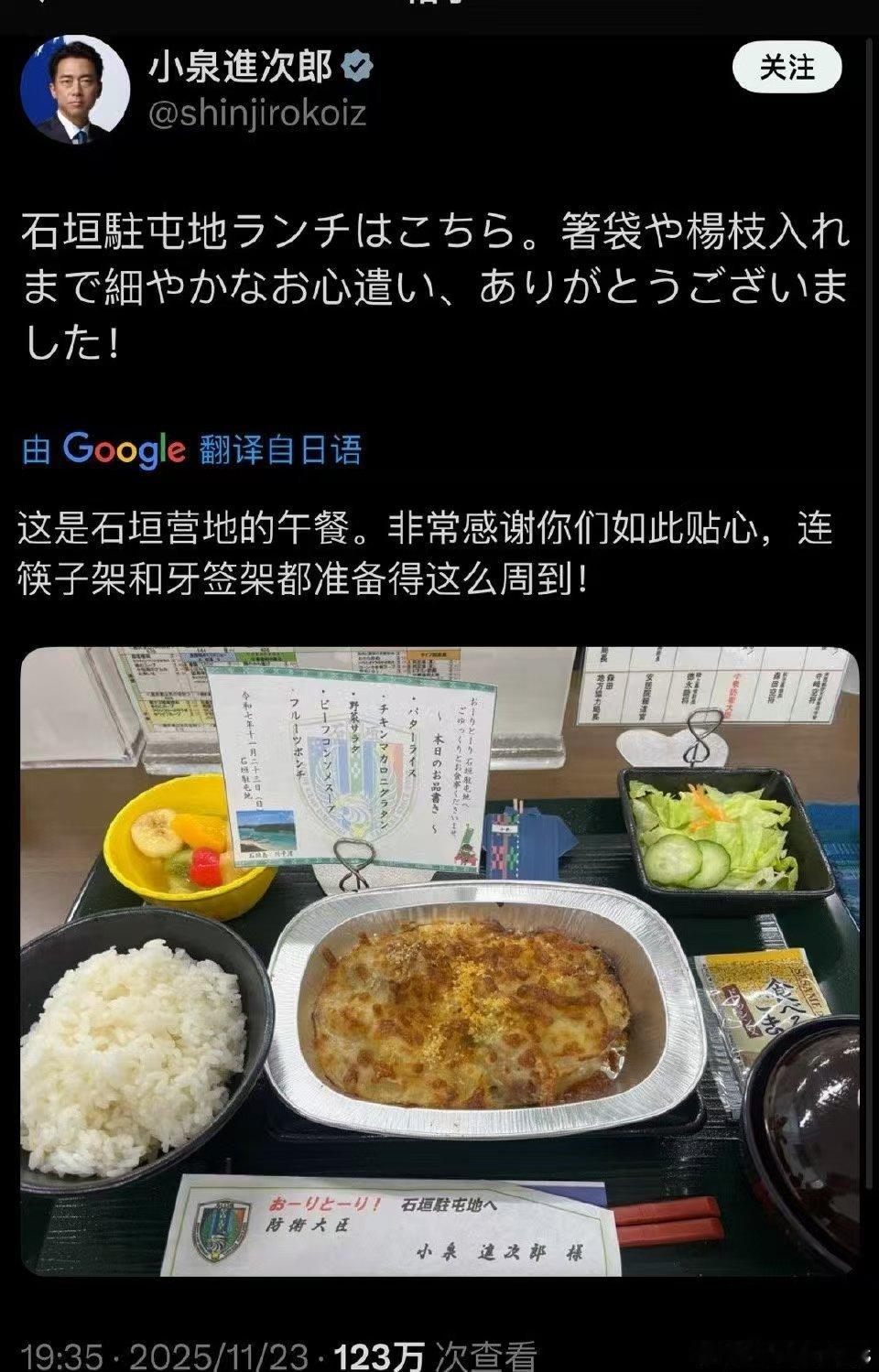 【日军后勤暴露问题】11月23日,日本防卫大臣、小泉纯一郎之子小泉进次郎视察石垣岛,该岛位于日本冲绳县八重山群岛,是八重山群岛的政治、经济、教育和交通中心,面积为222.6平方公里,是琉球群岛内仅次于琉球岛和西表岛的第三大岛。距离台湾岛200公里,距离钓鱼岛不足170公里。要说的是小泉在视察期间午餐,其用餐看来伙食很一般,没有很多卡路里热量,分量也不够,虽然对40多岁的人合适,但是对20岁大强度训练小伙子可是远远不够(你想多吃,再去盛饭,但是兵曹让吗?老兵让吗?)。转发区里有陆上自卫队军人在抱怨因为经费削减,自己之前值班期间要自己花钱吃午餐。这明显是后勤保障延伸不到。看来日军虽然在积极准备对华作战,但后勤供应保障依然不是太给力,这可是困扰日军上百年的老难题了,一看就是积习难改呀。这是因为海洋国家军队的作战单位极其分散,日军历史上历来如此,建制被打散后难以保证后勤单位实时和有力支撑,这更与国力财力不足、一贯轻视对战斗员的后勤保障有正相关的关联系。