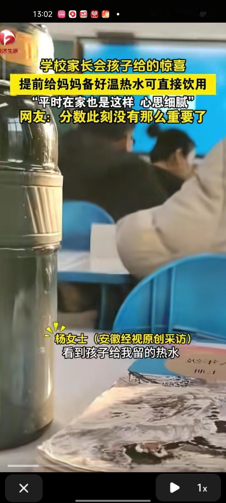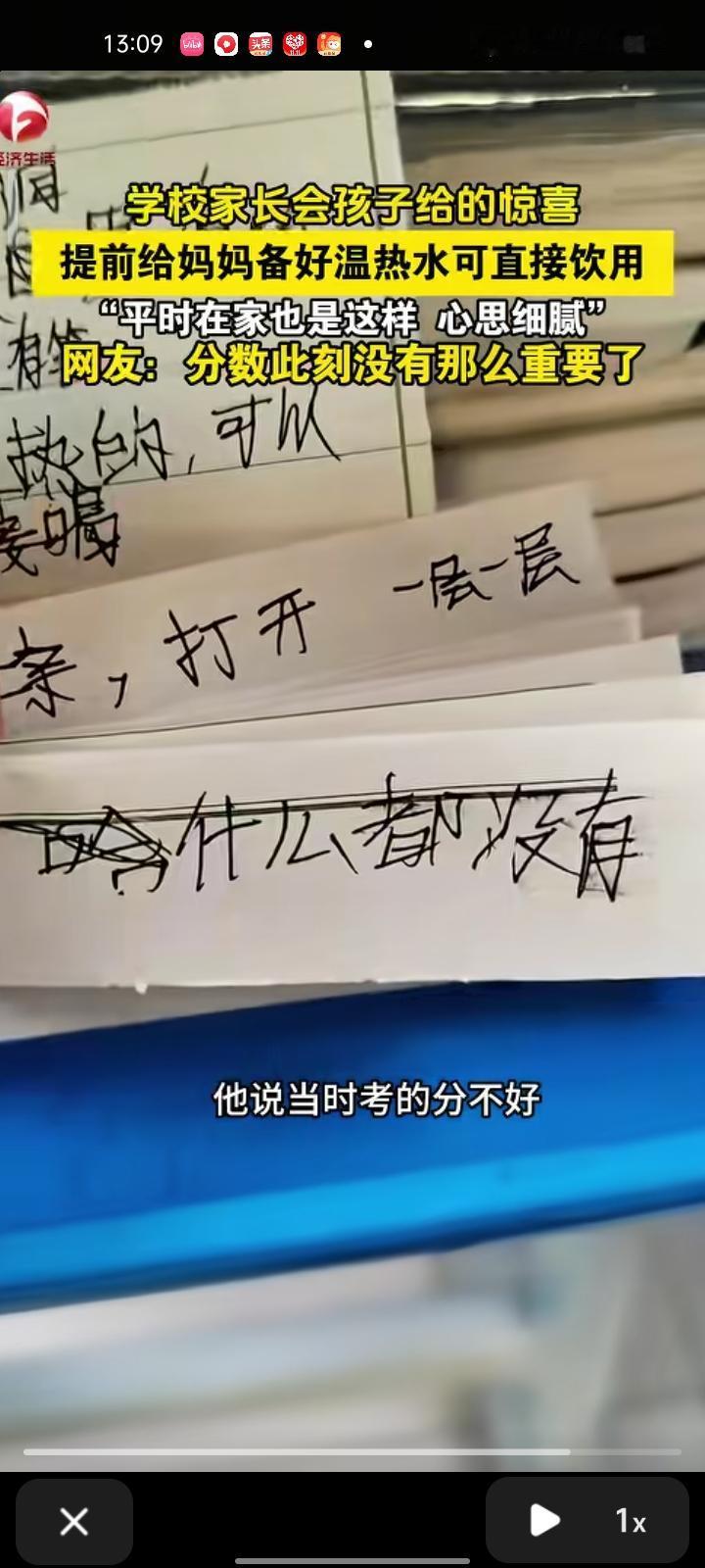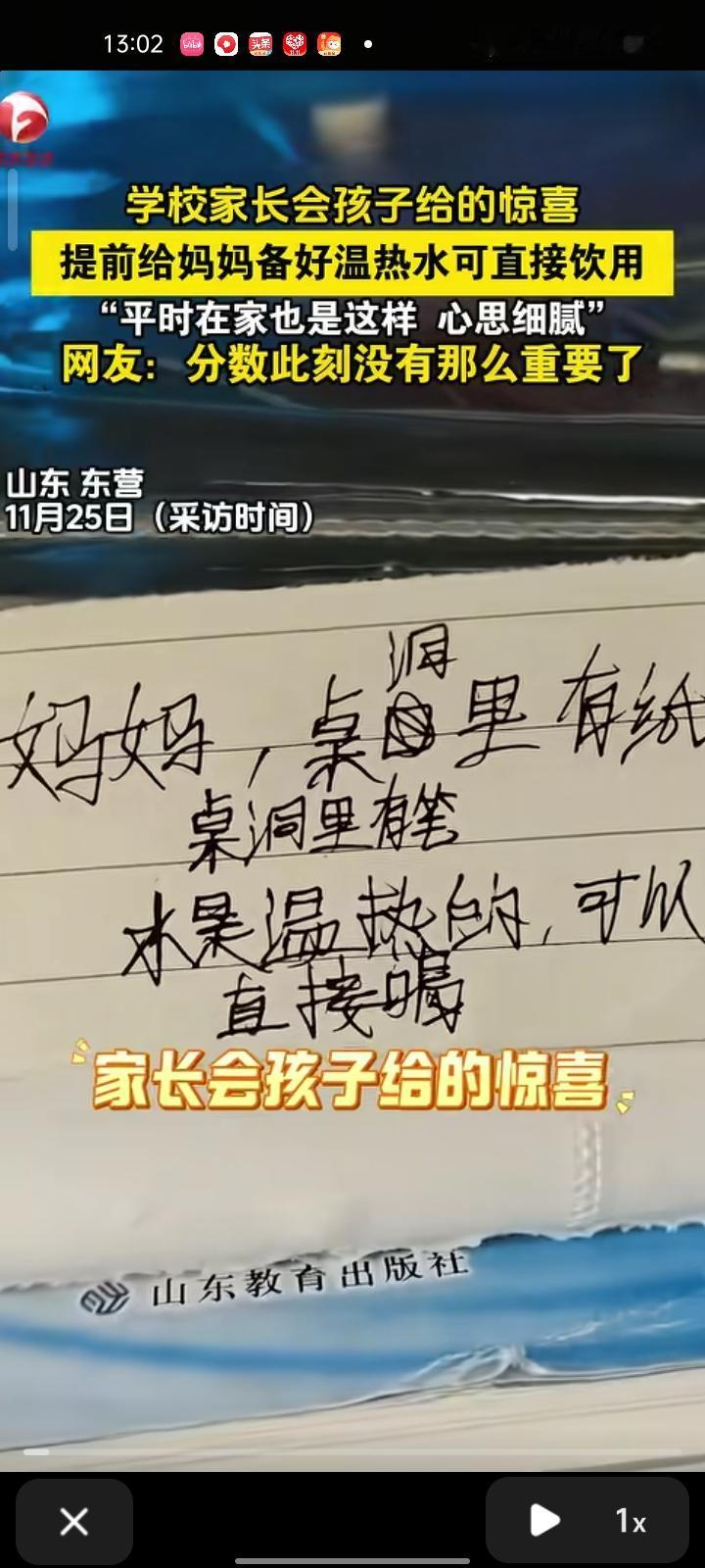 11 月21日,山东东营。女子晒视频称,去参加学校的家长会,看到桌上有儿子准备的热水,下面有一张长字条,写着“打开,一层一层”,翻到底感到哭笑不得。问儿子才知道,他说这出考得不好,怕妈妈生气才出的这招。