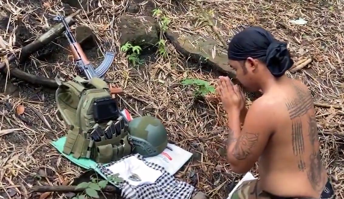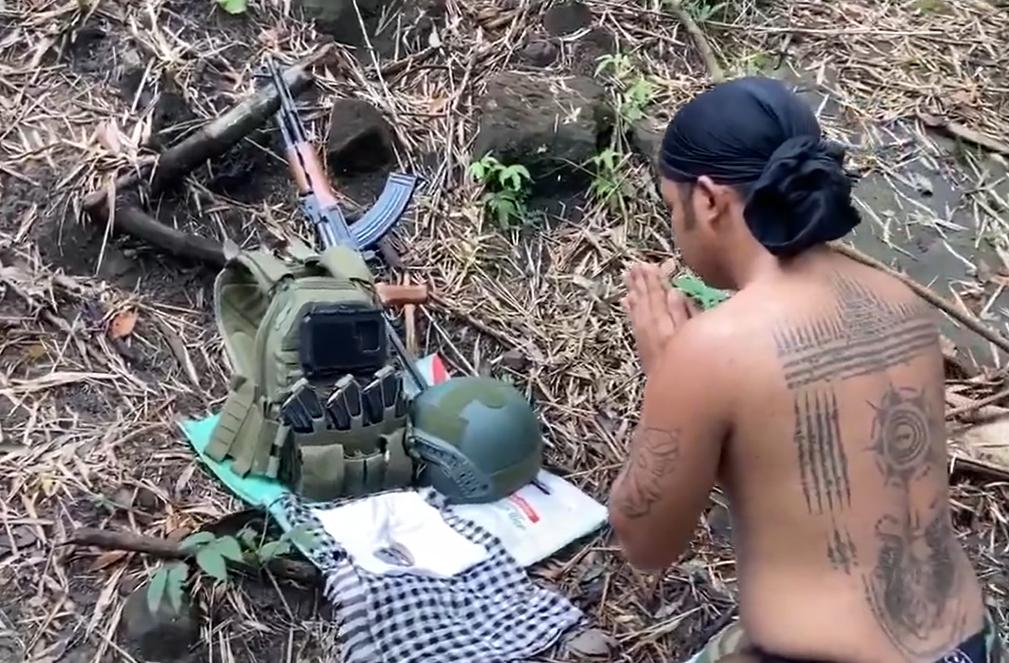 虔诚的柬埔寨佛教徒士兵! 在上阵作战之前,这名柬埔寨士兵,向自己的军装和武器装备跪拜!大家不要嘲笑这样的信仰,要知道柬埔寨士兵,要去上战场,谁生谁死,那都不好说。所以在战前做一个祈祷,也是求得一个心理安慰,这样在冲锋和打仗的时候,就觉得有佛祖佛祖保佑,不会彻底地带走。 总体而言,信仰是不可以被嘲笑的,再说这样的佛教徒,也是真心实意的想得到佛祖的庇护,能够活下来。但是这样的庇护,大多都是为自己能活下去,而拜佛是值得尊敬的,毕竟谁也不想在战场上就这么失去生命。 不过这名柬埔寨士兵的后背,纹满了纹身,,还是挺特别的。他们的单兵装备其实咱们很熟悉,就是咱们的56式或者81杠步枪,加上弹夹,以及咱们传统的子弹袋,都是相当的熟悉的。柬埔寨士兵,用的几乎是一水的中式武器,所以咱们看得很亲切。 这名士兵也是真的努力!