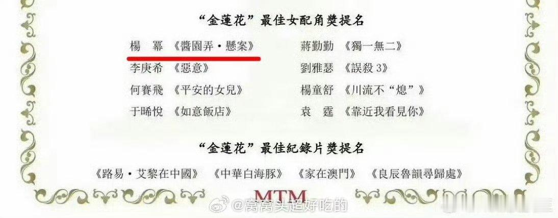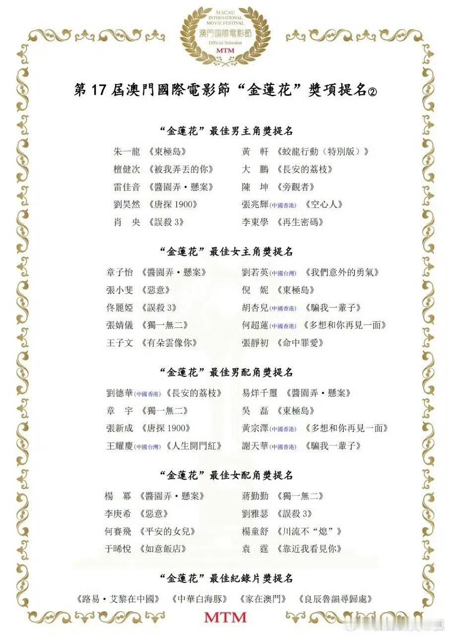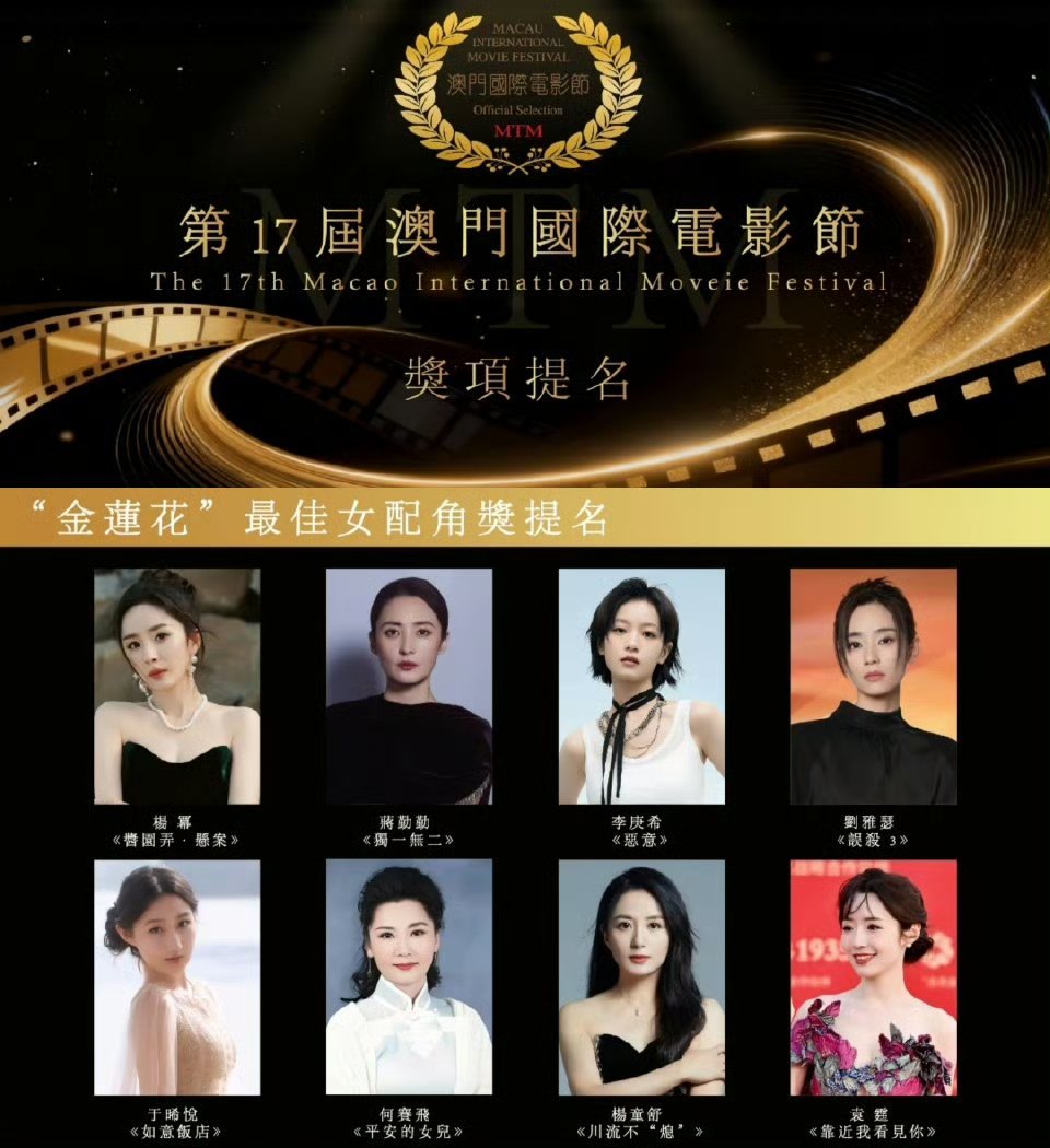 第17届澳门国际电影节金莲花奖最佳女配角提名名单最佳女配角提名杨幂 《酱园弄·悬案》李庚希 《恶意》何赛飞 《平安的女儿》于晞悦 《如意饭店》蒋勤勤 《独一无二》刘雅瑟 《误杀3》杨童舒 《川流不“熄”》袁霆 《靠近我看见你》