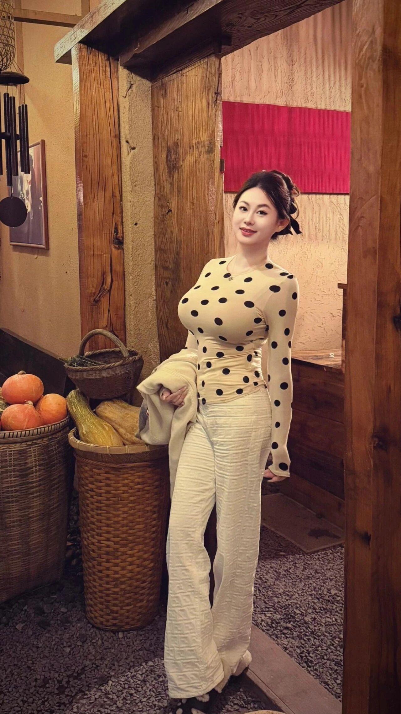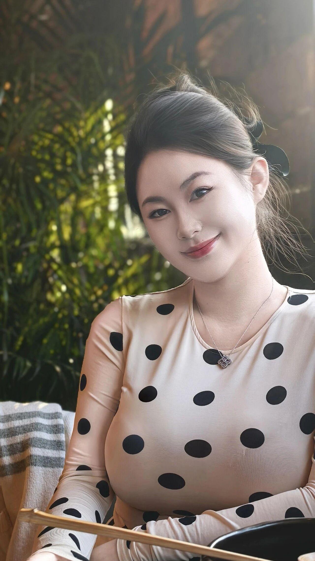 暮春的薄阳透过玻璃幕墙,在米白桌布上织出菱形光斑。她指尖轻叩骨瓷杯沿,黑色波点从袖口蜿蜒至腕间,像一串凝固的夜露。茶汤腾起的热气漫过唇畔笑意,在睫毛上凝成细碎星子,连马尾辫垂落的发丝都沾着茉莉香。 手机屏幕在餐盘旁明明灭灭,映出半块抹茶慕斯的倒影。银勺斜倚在褶皱餐巾上,勺柄镌刻的玫瑰纹路与裙摆蕾丝遥相呼应。背景墙的龟背竹探出新叶,叶脉间流淌着吊灯洒落的蜜色光晕,将整个空间晕染成暖调的油画。 她忽然倾身向前,波点衬衫随着动作泛起涟漪,露出锁骨处若隐若现的银链。杯沿抵住下唇的刹那,邻座风铃叮咚作响,惊起悬在绿植间的光斑,纷纷坠入她晃动的茶汤。手机震动时,屏幕亮起全家福照片,未读消息的红点与盘中樱桃酱洇染出相似的艳色。 当侍应生添水的水柱划出银色弧线,她正用勺尖追逐盘底残存的糖霜。波点投影在瓷盘边缘,化作跳动的音符,应和着空调系统低吟的送风声。某片龟背竹的影子爬上裙裾,将白色短裙染成朦胧的翡翠色,而她的笑声早已融进氤氲茶香,成为这个午后最生动的注脚。