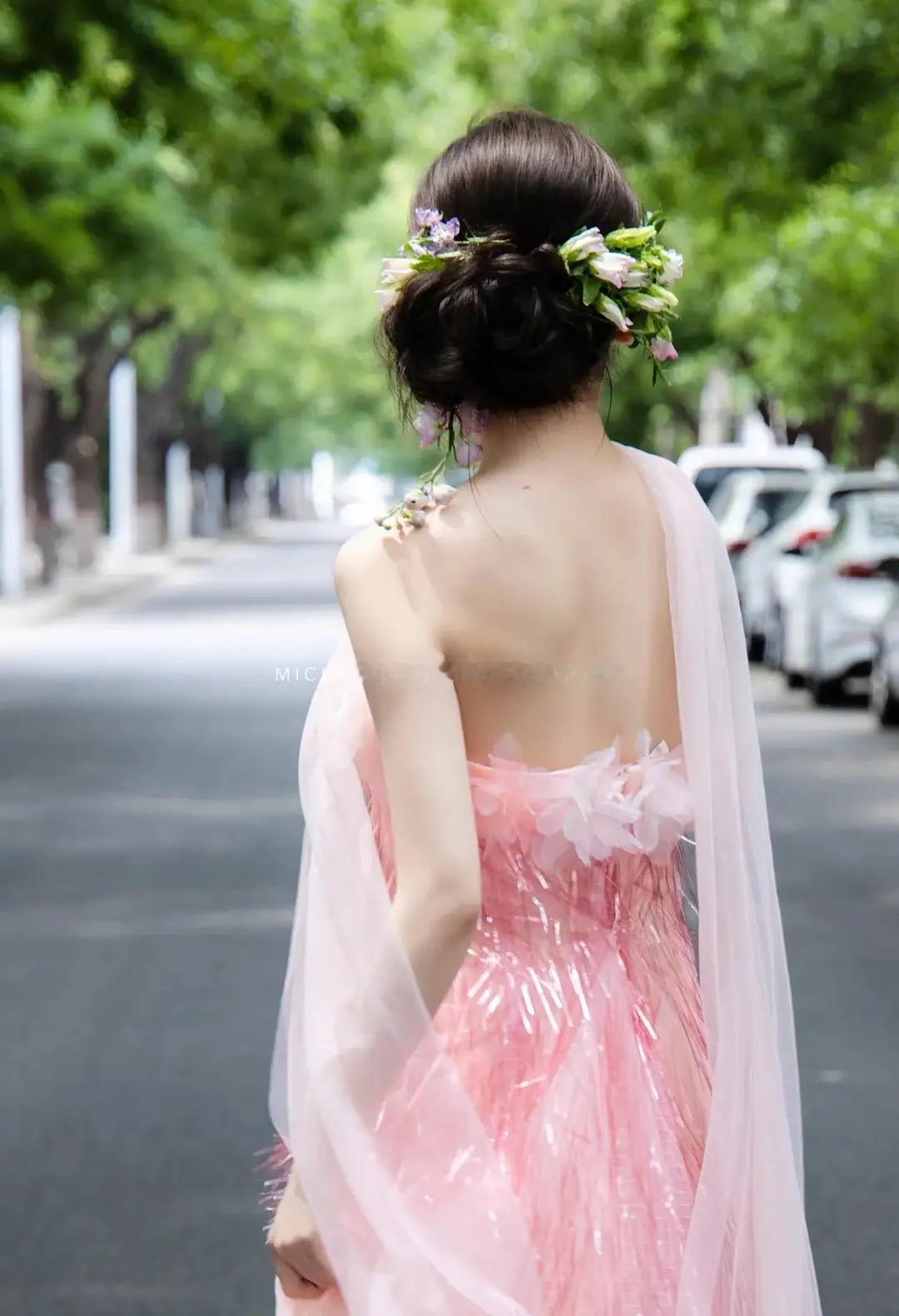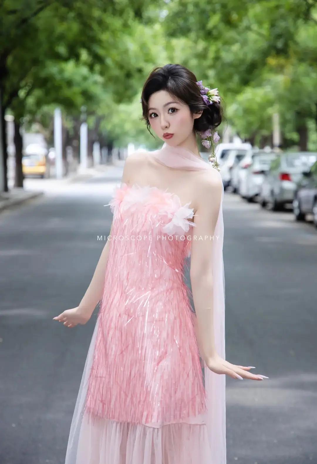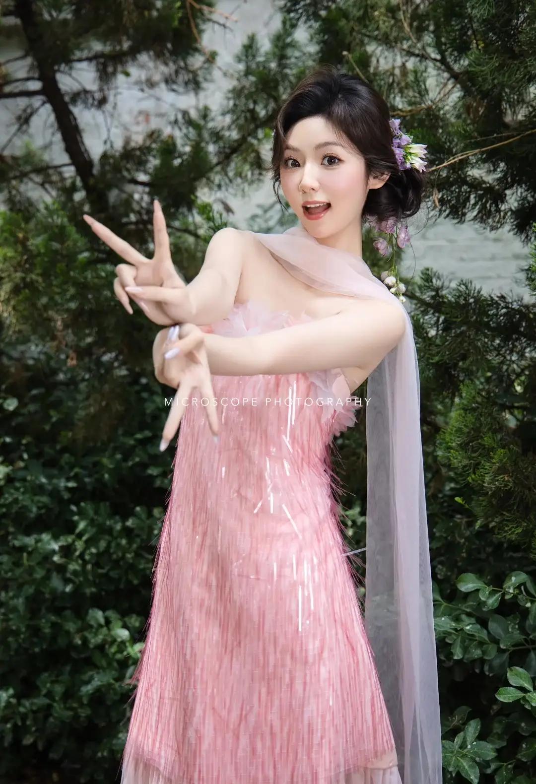 暮春的薄雾尚未散尽,阳光穿过榉木枝叶的间隙,在她藕粉色的缎面裙摆上织出细碎光斑。少女赤足立于青苔斑驳的磐石,裙裾被风掀起柔和的弧度,像一朵骤然绽放的木槿。发间点缀的珍珠与野花缠绕成冠,垂落的发丝沾着晨露,在颈侧勾勒出朦胧的金线。 她屈指轻触胸前飘落的合欢花瓣,指甲上淡樱色珠光与裙摆光泽遥相呼应。身后十步开外,溪流在鹅卵石上撞出泠泠清响,水汽氤氲中,几株野生铃兰正将露珠抖落在她脚边。林深处传来画眉的清啼,惊起她鬓角颤巍巍的白色小苍兰,花瓣坠入衣褶时,惊动了停驻在裙裾褶皱里的一只蓝闪蝶。 当风掠过树冠,万千叶片翻涌成碧浪。她忽然仰起脸,睫毛上跳跃的光点便簌簌落进眼眸,将瞳孔染成琥珀色。指节无意识摩挲着锁骨处的银链,链坠是片镂空的银杏叶,此刻正将阳光切割成星芒,在她雪白的肌肤上游走。远处迷蒙的绿意里,几株野蔷薇探出带刺的枝条,恰好框住她微微踮起的足尖。 暮色初临时分,最后一缕斜阳吻过她发间的珍珠。少女弯腰拾起裙角的蓝闪蝶,蝶翼在她掌心开合三次,忽而振翅飞向林间渐浓的雾霭。她望着蝶影消失的方向轻笑,眼尾漾开的笑意比裙摆的褶皱更温柔,连带着整片森林都跟着屏住了呼吸。