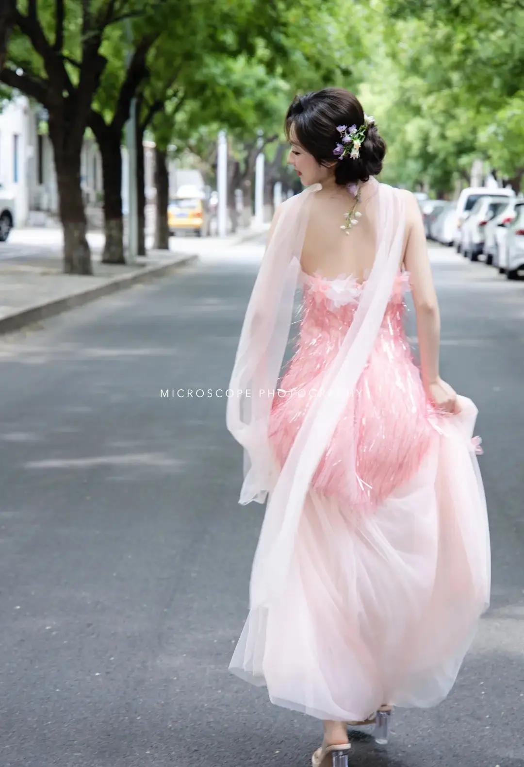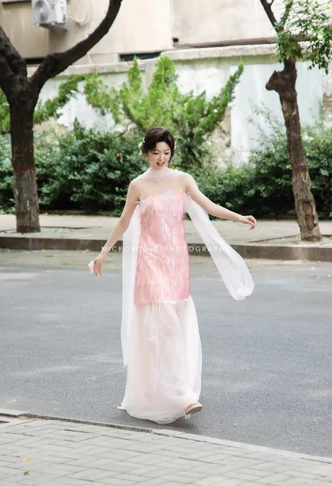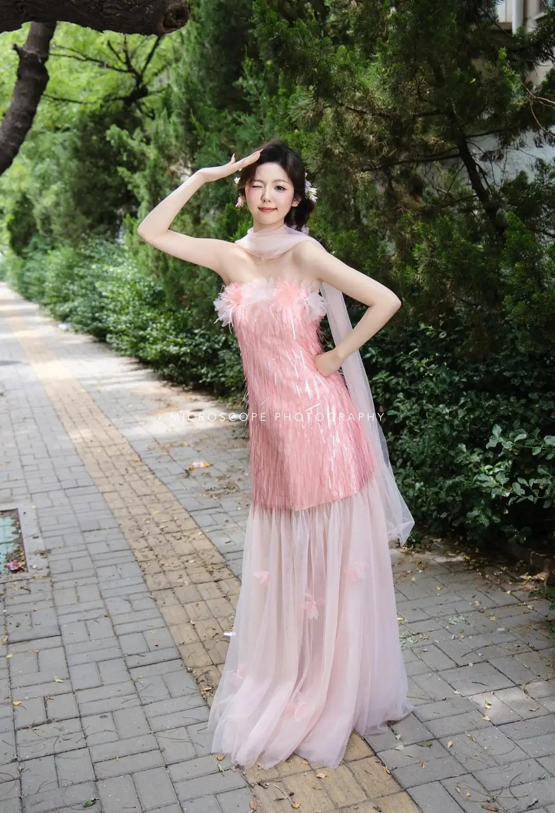 暮春的薄雾尚未散尽,阳光穿过榉木枝叶的间隙,在她藕粉色的缎面裙摆上织出细碎光斑。少女赤足立于青苔斑驳的磐石,裙裾被风掀起柔和的弧度,像一朵骤然绽放的木槿。发间点缀的珍珠与野花缠绕成冠,垂落的发丝沾着晨露,在颈侧勾勒出朦胧的金线。 她屈指轻触胸前飘落的合欢花瓣,指甲上淡樱色珠光与裙摆光泽遥相呼应。身后十步开外,溪流在鹅卵石上撞出泠泠清响,水汽氤氲中,几株野生铃兰正将露珠抖落在她脚边。林深处传来画眉的清啼,惊起她鬓角颤巍巍的白色小苍兰,花瓣坠入衣褶时,惊动了停驻在裙裾褶皱里的一只蓝闪蝶。 当风掠过树冠,万千叶片翻涌成碧浪。她忽然仰起脸,睫毛上跳跃的光点便簌簌落进眼眸,将瞳孔染成琥珀色。指节无意识摩挲着锁骨处的银链,链坠是片镂空的银杏叶,此刻正将阳光切割成星芒,在她雪白的肌肤上游走。远处迷蒙的绿意里,几株野蔷薇探出带刺的枝条,恰好框住她微微踮起的足尖。 暮色初临时分,最后一缕斜阳吻过她发间的珍珠。少女弯腰拾起裙角的蓝闪蝶,蝶翼在她掌心开合三次,忽而振翅飞向林间渐浓的雾霭。她望着蝶影消失的方向轻笑,眼尾漾开的笑意比裙摆的褶皱更温柔,连带着整片森林都跟着屏住了呼吸。
