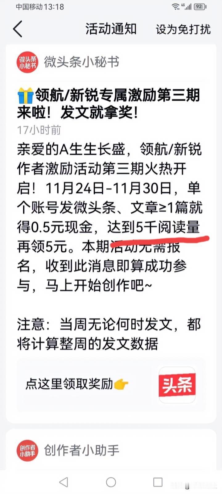 这两个关于微头条发文激励的通知,一个说阅读量达5千就有5元,另一个则说阅读量要达