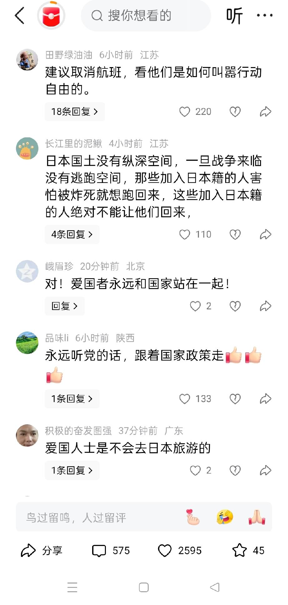 看着头条消息99+,比捡到钱还高兴。 昨晚发了一条作品,关于中国人挤满日本机场的微头条。没晓得引起广大读者的共鸣。整整爆了一整天。 很多评论者评论说,爱国者是不会去日本旅游和生活的。 还有评论者说,爱去日本就永远留在日本。评论区体验了广大爱国情怀。 是啊,作为中国人,要永远爱国,积极响应国家号召。有国才有家。在这敏感危机时刻,更加要以国家利益为重。爱国者永远和国家站在一起。大家觉得呢?