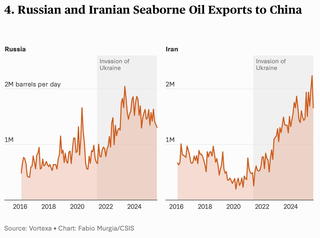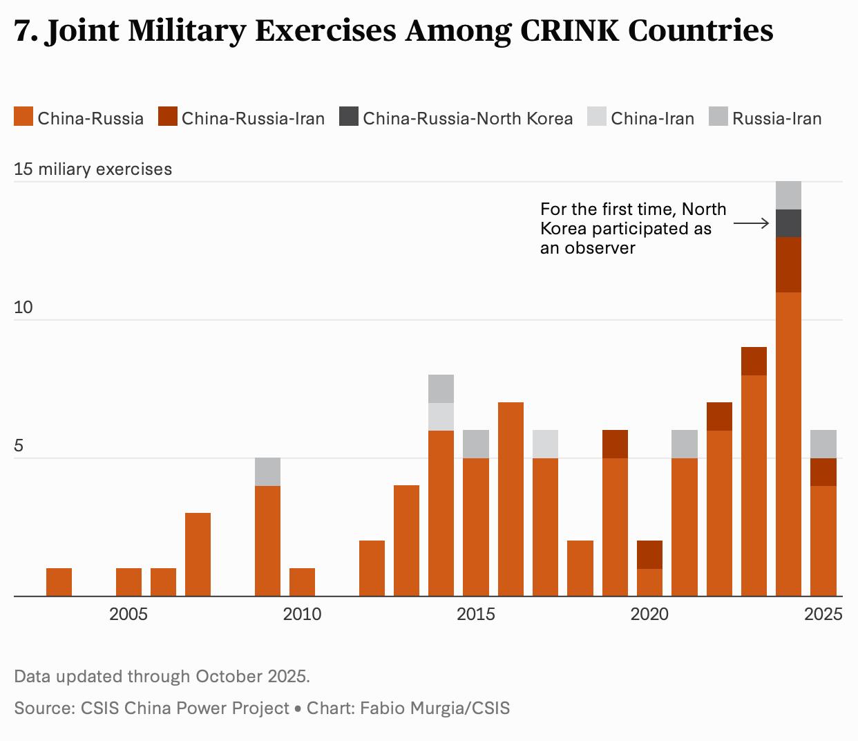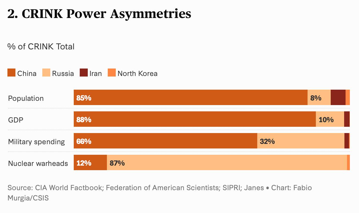 华府政策圈近来出现一个愈发常用的框架:将中国、俄罗斯、伊朗和朝鲜视为一个在关键领域加速靠拢的四国组合“CRINK”。根据美国战略与国际问题研究中心(CSIS)最新发布的数据系列,这一概念得到更为系统的量化支持。报告显示,CRINK四国在经济、能源与安全合作方面的协同(alignment)力度自俄乌战争以来显著增强,中国与俄罗斯构成其核心。四国整体拥有全球五分之一人口和全球四分之一GDP,并在国防投入与核力量上占据重要比重。 CSIS数据显示,合作模式虽存在明显不对称,但趋势线清晰:中俄间的贸易额在2024年超过2450亿美元,远高于其他双边组合,中国对俄“双用途”关键设备出口激增,其中部分品类较2021年上涨逾三十倍。能源流向同样强化这一联动:2025年上半年中国从俄罗斯和伊朗的海运原油进口量分别比战前增长80%与400%。在安全层面,俄乌战争颠倒了过去的军火供需关系,俄罗斯成为伊朗与朝鲜的武器“净进口方”,而朝俄于2024年签署相互防务条约并扩大军事人员派遣。自2022年以来,至少37场涉及CRINK国家的联合军演举行,显著高于战前水平。 CSIS同时强调,CRINK并非一个制度化集团,其内部能力差距与利益分歧依然明显,中俄在联合国安理会的投票一致度甚至略有下降。但无论在贸易、能源还是安全合作上,数据都显示出协作的加速趋势。这种正在形成、但尚未固化的跨领域协同,正成为华盛顿外交与安全界讨论中日益突出的分析框架。 图片来源于网络