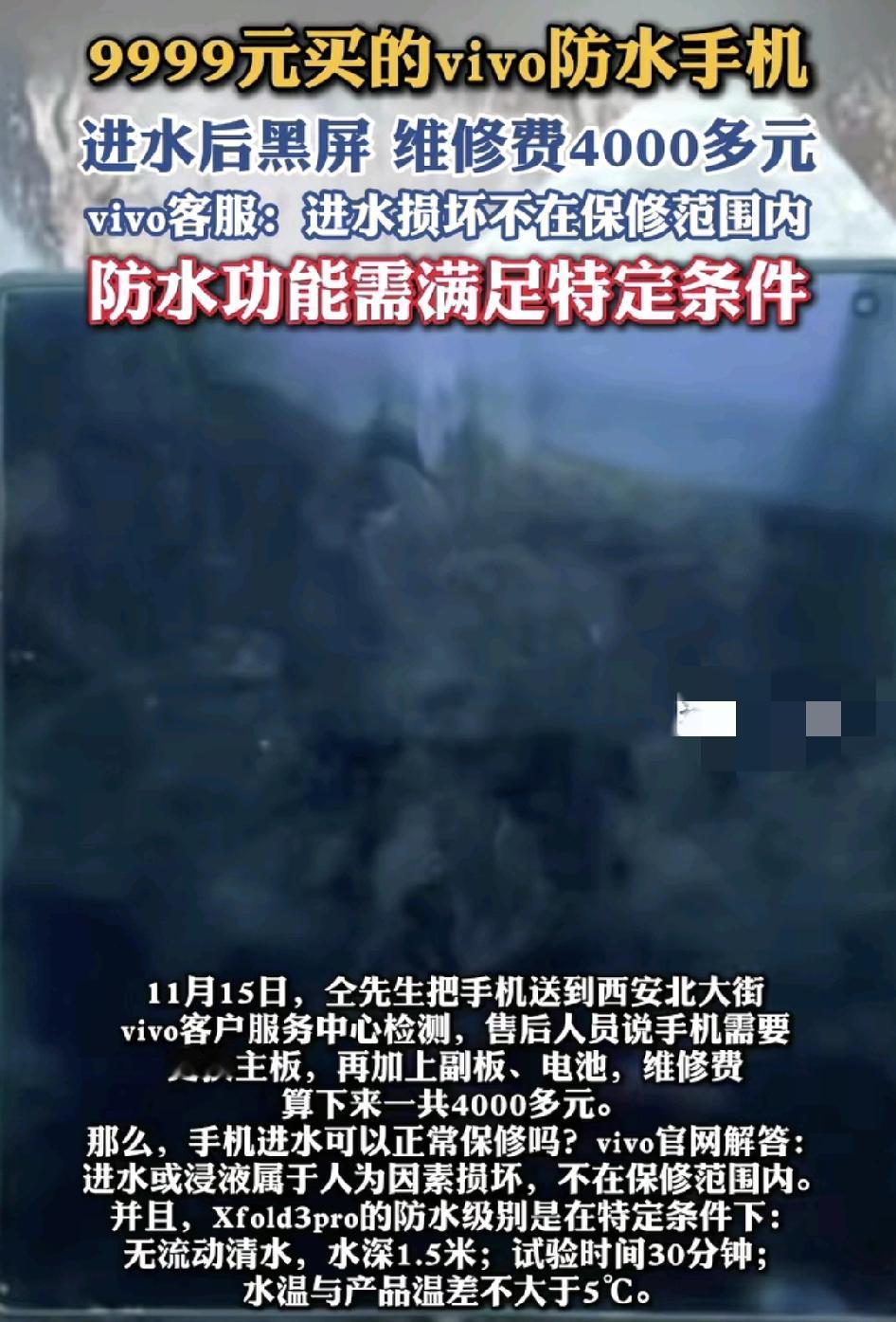 西安一男子花了1万块购买了vivo某型号的手机,当时看中的就是该款手机有防尘防水的功能,没想到自己在一次刷牙的过程中,手机意外掉出脸盆,碰到水之后拿起来就黑屏了。拿到维修中心工作人员称需要更换主板,电池等等,一共维修费4000多块钱。但男子认为该手机本身就有防水的功能,后来工作人员又称,所谓的防水是指定在一定的条件之下。无流动清水,水深1.5米;试验时间30分钟; 水温与产品温差不大于s℃o,并且称主板可以打5折,先修理主板一共是2000元的维修费用。很多人说花1万块买该品牌手机不值得,而且手机就这么一摔就黑屏了,质量令人担忧。