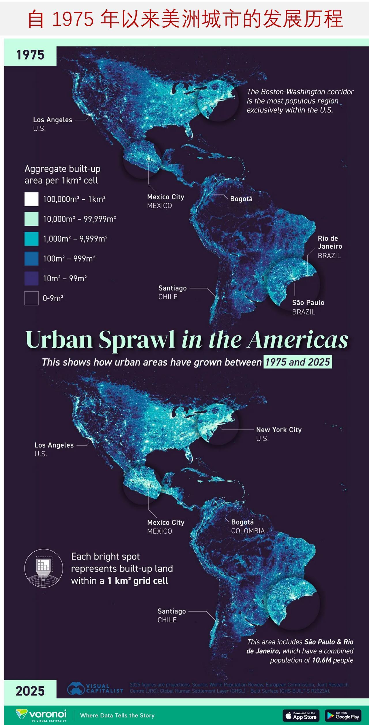 图说自 1975 年以来美洲城市的发展历程 自 1975 年以来,美洲地区的城市化进程发生了显著变化。下面图表展示了过去五十年间,北美洲、中美洲和南美洲的主要大城市在人口和密度方面的发展情况。此图表的数据来源于“世界人口评论”。 尽管美国的城市人口持续增长,但拉丁美洲的城市却经历了最为显著的都市扩张。 ——拉丁美洲的迅猛城市化进程 像圣保罗、墨西哥城和波哥大这样的城市,自 1975 年以来人口增长了两倍以上。例如,圣保罗的人口从不到 1000 万增长到了近 2300 万。这种增长反映了拉丁美洲更广泛的城市化趋势,由于经济变化、更好的就业机会以及城市提供的服务便利性增加,农村人口向城市迁移的速度加快了。 ——美国城市的稳步扩张 美国的一些大城市地区,如纽约市和洛杉矶市,人口增长较为显著但较为平稳。纽约市的人口从 1975 年的 1590 万增长到了 2025 年的超过 1900 万。东海岸、五大湖区和南加州的走廊地区一直是人口聚集的热点区域。 ——加拿大稀疏的城区分布格局 尽管加拿大地域辽阔,但除了一些像多伦多和温哥华这样的重要城市区域外,其整体城市化程度仍然较低。地理障碍和恶劣的气候使得该国大部分人口集中在狭窄的南部地带。