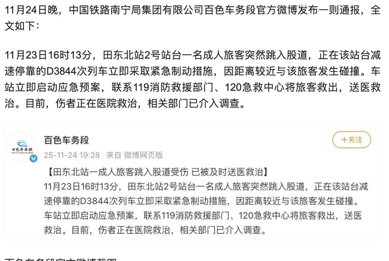 旅客跳入股道与动车碰撞事件通报来了! 称这起事件是发生在11月23日,广西百色的田东北站,一名成年旅客突然跳入股道,由于需要停靠的列车太近,所以虽然进行了紧急制动,但是还是与这名旅客发生了碰撞,而现在这名旅客正在医院接受救治。结合多家媒体的报道,以及官方的通报,涉事的旅客右腿是开放性骨折,虽然意识相对比较模糊,但是生命体征比较平稳,言外之意是大概率是没有生命危险的。 那问题就来了,涉事旅客是因为什么原因,才突然跳入股道呢?而他需不需要为此而担责呢?咱先看第一个问题,官方只是通报了事情的经过,以及伤者的一个情况,对于具体的原因,并没有透露。不过一般情况下,也只有两种可能,第一种就是东西掉下去,然后为了避免财物损失,所以不顾一切掉下去。第二种就是有预谋的,就是纯粹个人想不开,然后在列车到来之前,故意用这样的办法,来让自己解脱。可根据媒体披露的情况,在他跳入股道之后,曾试图向轨道外侧躲避。所以现在就无法确定,到底是意外,还是一场预谋了。 那如果他之后清醒过来,是否需要为此担责呢?可以明确的是他的这种行为,就是违法行为。如果他随意跳入股道,导致列车延误可处5到10日的拘留,并处500元以下的罚款,如果造成了列车事故,不仅需要赔偿损失,而且还有可能承担相应的刑事责任。而在这起事故当中,男子随意跳入股道的行为,已经造成了列车晚点,所以只要他醒过来,拘留罚款肯定是少不了的。而且还需要承担个人的医药费。 所以他的行为就是典型的,坑人还坑己,如果没有家人的话还好,有家人的话,也会把家人坑得很残。最后还是奉劝所有人一句,安全从无小事,一定要留神再留神,莫一时冲动与疏忽,坑了自己,也坑了家人。