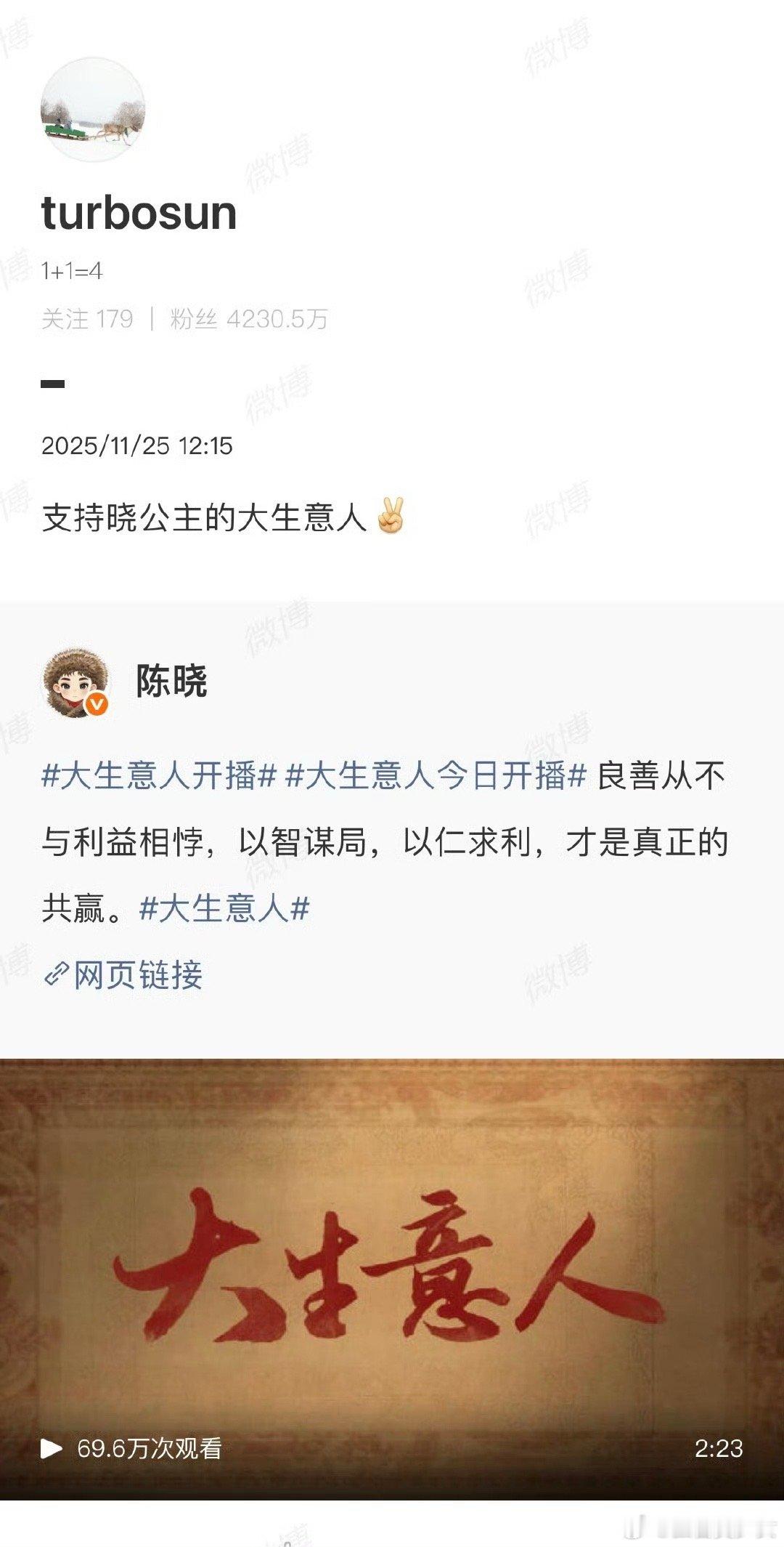陈晓新戏《大生意人》今日开播,于正孙俪为陈晓新剧打call,已准备好板凳,坐等今