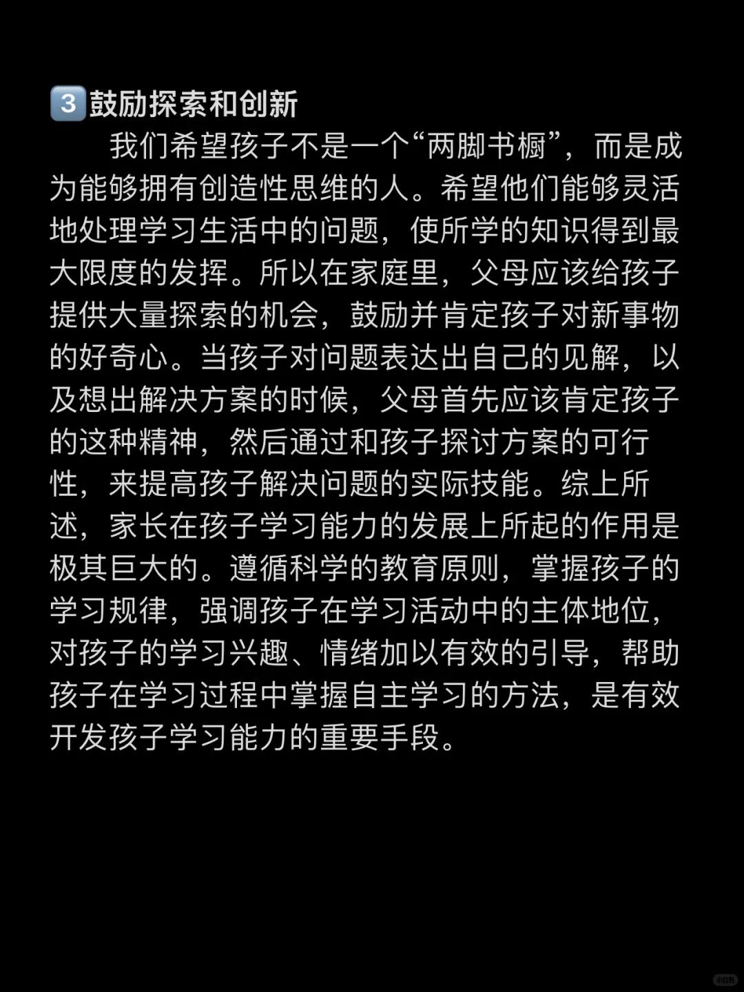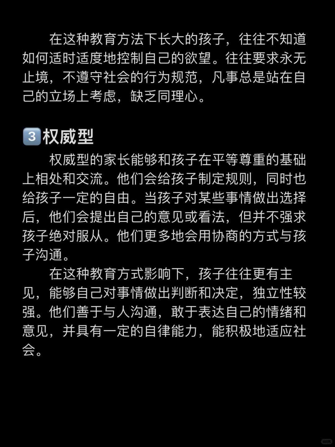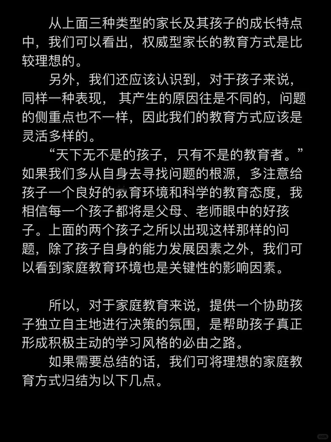解读不同的家庭教育方式 心理学家把家长的教育态度和教育方式分为三种类型 严厉型、放任型和权威型。 严厉型 在这种家庭里,家长往往不考虑孩子的要求,以传统的家长制作风,要求孩子绝对服从,孩子没有表达意愿的机会,亲子之间严重缺乏沟通。在这种管束严厉的教育氛围里长大的孩子往往会向两个极端发展:要不就是特别儒弱、没有主见、依赖感强,要不就是特别不服管教,刻意和别人拧着来。 放任型 放任型家长教育方式与前者正好相反,往往会出现两种教育孩子的态度:一种是过度溺爱、 保护,对孩子的事情事无巨细一概包办, 没有给孩子提供动手学习的机会;一种是放任自流,对孩子的行为听之任之,认为自己无法对孩子的成长负责,或者觉得孩子年龄还小,长大后自然而然就会了。 权威型 权威型的家长能够和孩子在平等尊重的基础上相处和交流。他们会给孩子制定规则,同时也给孩子一定的自由。当孩子对某些事情做出选择后,他们会提出自己的意见或看法,但并不强求孩子绝对服从。他们更多地会用协商的方式与孩子沟通,在这种教育方式影响下,孩子往往更有主见,能够自己对事情做出判断和决定,独立性较强。 从上面三种类型的家长及其孩子的成长特点中,我们可以看出,权威型家长的教育方式是比较理想的。 所以,对于家庭教育来说,提供一个协助孩子独立自主地进行决策的氛围,是帮助孩子真正形成积极主动的学习风格的必由之路。如果需要总结的话,我们可将理想的家庭教育方式归结为以下几点。 1⃣️尊重孩子的个性 尊重代表着父母不是站在高高在上的位置上俯视孩子的成长,而是与孩子一起感受和体验成长路上的风风雨雨,在孩子的心中播种下为自己负责、主动探索、体会成功的种子。 2⃣️善待他人 鼓励和引导孩子与伙伴交往,培养孩子健康的社会交往技能。让孩子意识到与同伴交往是自己成长的一个环节,能够处理好所出现的问题,是锻炼自己、体验成功的必经之路。同时,这也是培养孩子独立性的重要一环。 3⃣️鼓励探索和创新 家长在孩子学习能力的发展上所起的作用是极其巨大的。遵循科学的教育原则,掌握孩子的学习规律,强调孩子在学习活动中的主体地位,对孩子的学习兴趣、情绪加以有效的引导,帮助孩子在学习过程中掌握自主学习的方法,是有效开发孩子学习能力的重要手段。