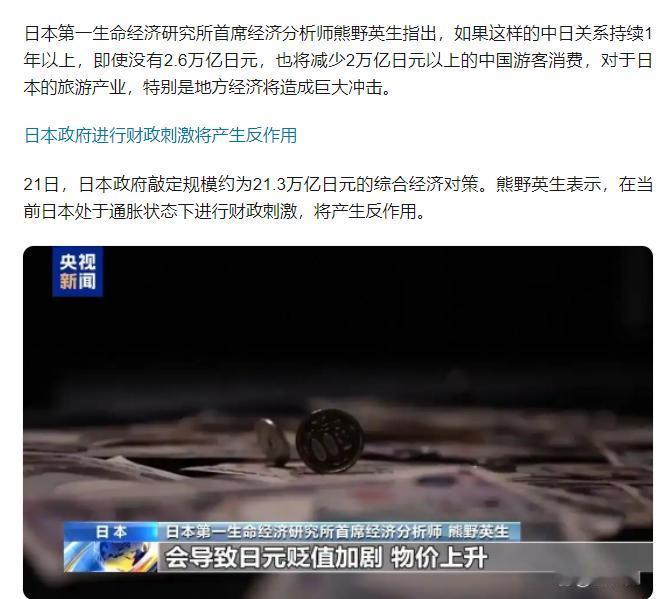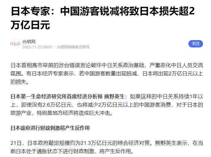 日本专家警告!日本第一生命经济研究所首席经济分析师 熊野英生:如果这样的中日关系持续1年以上,即使没有2.6万亿日元,也将减少2万亿日元以上的中国游客消费,对于日本的旅游产业,特别是地方经济将造成巨大冲击。   2024年日本国际游客花的钱里,咱们占了足足五分之一还多,每5日元就有1日元是中国人掏的。   到了2025年前十个月,中国内地赴日游客超800万人次,占了日本外国游客总量的近四分之一。   更关键的是消费力,咱们游客在日本人均花24万日元,差不多1.1万人民币,是欧美游客的2.3倍,比东南亚游客更是高出三倍多。   现在游客一减少,日本地方经济的短板立马就露出来了。   冲绳当地40%的免税店收入都靠中国客人,观光巴士公司旺季时20辆巴士全忙不过来,现在一半都停在停车场盖着防尘布。   连东京运营四十多年的屋形游船公司都受波及,近期就有240人的中国旅行团取消预约。   中国发布赴日旅游提示后,资生堂一天就跌了11%,要知道它三成以上的销售额都靠中国游客。   三越伊势丹百货跌了10.64%,东京迪士尼运营商跌了5%,连寿司郎、优衣库母公司这些企业股票也跟着受影响。   有数据统计,每减少100万中国游客,日本就会少2.3万个工作岗位,这对本就不景气的日本就业市场来说,无疑是雪上加霜。   更要命的是,这缺口根本没人能补上。东南亚游客数量不少,但人均消费只有咱们的三分之一;印度游客客单价更是低到四分之一,大多选经济型消费,不会碰高价奢侈品和化妆品。   有人拿2012年钓鱼岛事件时的情况对比,但现在的形势只会更严峻。   一方面咱们游客的消费结构早升级了,除了药妆、家电,还愿意为文化工坊、定制旅游花钱,这些都是带动地方经济的新增长点。   另一方面日本旅游业这些年越来越依赖中国市场,他们之前尝试吸引中东、印度游客,都因为消费习惯差异太大没成功。   要知道,现在外国游客消费已经是日本仅次于汽车的第二大外汇来源,旅游业占了日本GDP的7%,是经济增长的重要动力。   日本国内也开始着急了。北海道政府已经紧急开对策会议,冲绳地方政府更是直接呼吁修复对华关系,因为他们最清楚,没有中国游客,当地经济就活不了。   最近还有一百多名日本民众跑到首相官邸抗议,要求撤回破坏中日关系的言论。   说句实在话,咱们中国人一直讲究互利共赢,以前愿意去日本旅游,是喜欢那里的风景和服务,也顺便带动了当地经济。   现在这种局面,受伤的不只是日本商家,也让很多想出去看看的中国人多了顾虑。   旅游业对日本有多重要?2024年外国游客消费已经超过钢铁、半导体等传统产业,是他们经济的重要支柱。   2万亿日元的损失不是冰冷的数字,是濒临倒闭的小店,是面临失业的员工,是地方经济实实在在的伤痛。真心希望日本能认清形势,别再做破坏两国关系的事。