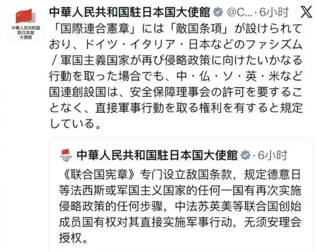 最高级别的战争警告来了!中国驻日本大使馆亮出了一张“合法开火牌”,根据联合国宪章的敌国条款,只要日本稍有异动,中国开火不需要联合国安理会批准,也不用管美国同不同意,这是一场针对日本法西斯本质的终极清算信号。 家里老人一说起抗战就掉眼泪,那几年啊,炮弹比地里的庄稼还多,逃荒的人群一眼望不到头,比整个村子的人都多。就这一场仗,咱中国死了三千五百多万人,才把日本侵略者给打回老家去。 不光咱中国,全世界都流了不知多少血,才总算把德意日这几个法西斯恶魔给彻底打垮。所以二战结束的时候,各国都咬着牙定了规矩:绝不能让这些战争贩子再有抬头的机会。《联合国宪章》里专门写的“敌国条款”,就是给日本这种战败国套上的紧箍咒。 现在中国驻日本大使馆亮明这张“合法开火牌”,可不是空喊口号,是攥着国际法这个硬家伙敲警钟呢。宪章里写得明明白白,对二战的战败敌国,只要它露出重新侵略的苗头,受害国采取必要行动,根本不用联合国安理会批准,更轮不到美国说三道四。咱这不是要挑事,是真怕历史再重演,你看现在的日本,越来越不对劲了。 刚过去的2025年,日本的防卫预算一下子涨到8.7万亿日元,比去年多了9.4%,都连着三年超万亿了。这钱花得全是“进攻味儿”:两千多亿日元砸去搞高超音速导弹,一千多亿日元用来弄军用卫星,还要新成立“宇宙作战团”,明摆着就是要跳出“专守防卫”的框框。 更让人恶心的是历史这笔账,日本右翼天天逼着改教科书,硬把“侵略”说成“进出”。2022年有部日本纪录片都给扒出来了,文部省常年在右翼的压力下歪曲历史,连南京大屠杀都敢往模糊了写。 有人说咱这是“小题大做”,但经历过战乱的人都懂,法西斯复活从来不是一下子炸开来的,都是温水煮青蛙。当年日本就是先扩军,再改历史,一步步把整个国家拖上战车的。现在它一边把中国当“假想敌”搞军事扩张,一边在历史问题上耍无赖,刚好踩中了“敌国条款”的红线。咱把态度亮出来,就是把丑话说在前面:再往前闯一步,就别怨国际法的大棒打下来。 美国总想着给日本撑腰,扯什么“美日同盟”,但在国际法面前,这同盟根本不好使。当年美国也是二战的受害国,宪章是它亲手签的,没道理护着一个想翻案的战败国。何况咱中国的底线在这儿摆着,不管是谁,敢动着重现法西斯的念头,就必须清算。这可不是针对日本老百姓,是针对那些揣着侵略野心的右翼势力。 咱中国从来不是好战的主儿,手里这张“合法开火牌”,其实更像块盾牌。谁也不想再看见炮弹砸进村子,不想再让孩子躲在防空洞里发抖。可要是日本非要撕毁历史协议,把军费变成炮弹,把教科书改成谎言,那咱只能用最硬的规矩,护最稳的和平。 这张“合法开火牌”,一半是警告,一半是纪念,纪念那些死在日本屠刀下的同胞,纪念那些为和平流干血的英雄。日本要是还有点良知,就该赶紧停下扩军的脚步,把历史教科书里的瞎话改回来。不然等那“紧箍咒”真勒紧了,再后悔可就晚了。