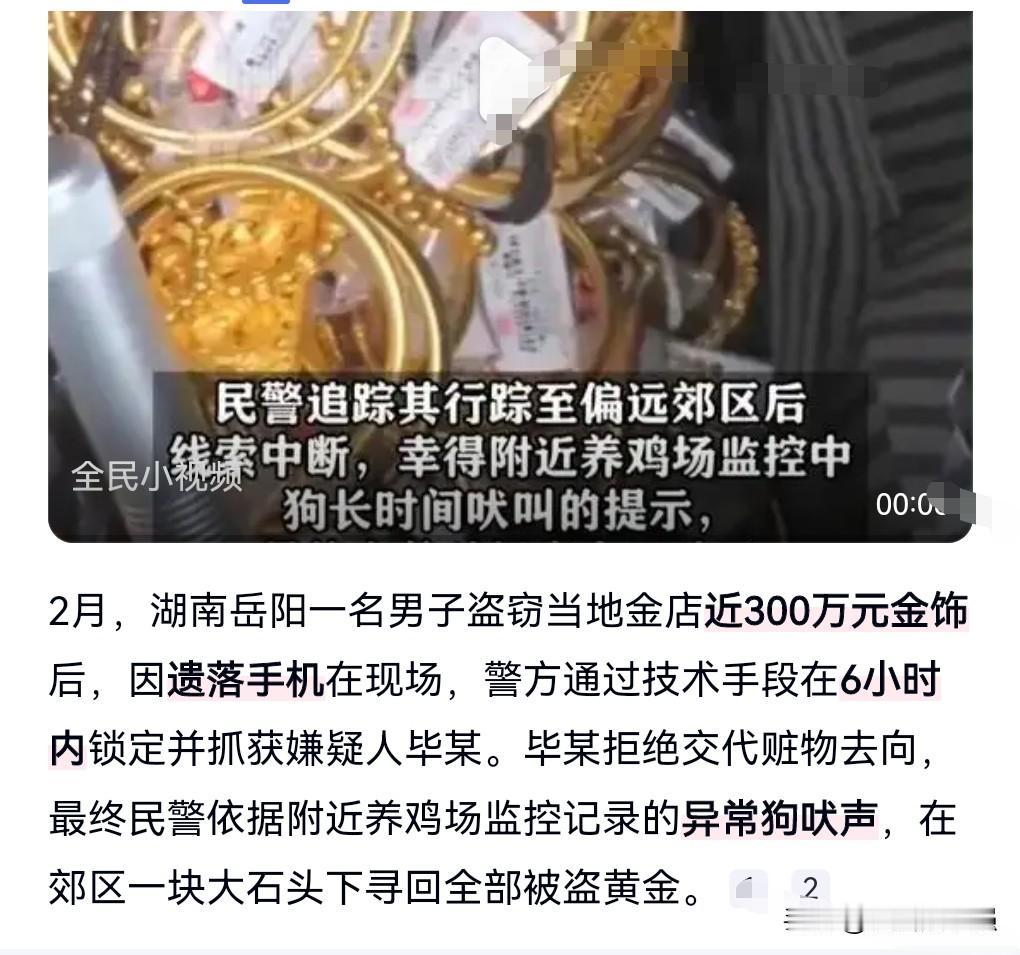 抓的好啊,抓的妙啊,实在是大快人心啊。 近日公布了这么一起案例。 案件发生在2月。 男子偷黄金落下手机不到6小时被抓。 竟然偷了300万的黄金,这下摊上事儿了。 但是他粗心大意,把手机落在现场。 他被抓后不肯说藏匿地点,但是警方通过两分钟狗叫声找到线索。