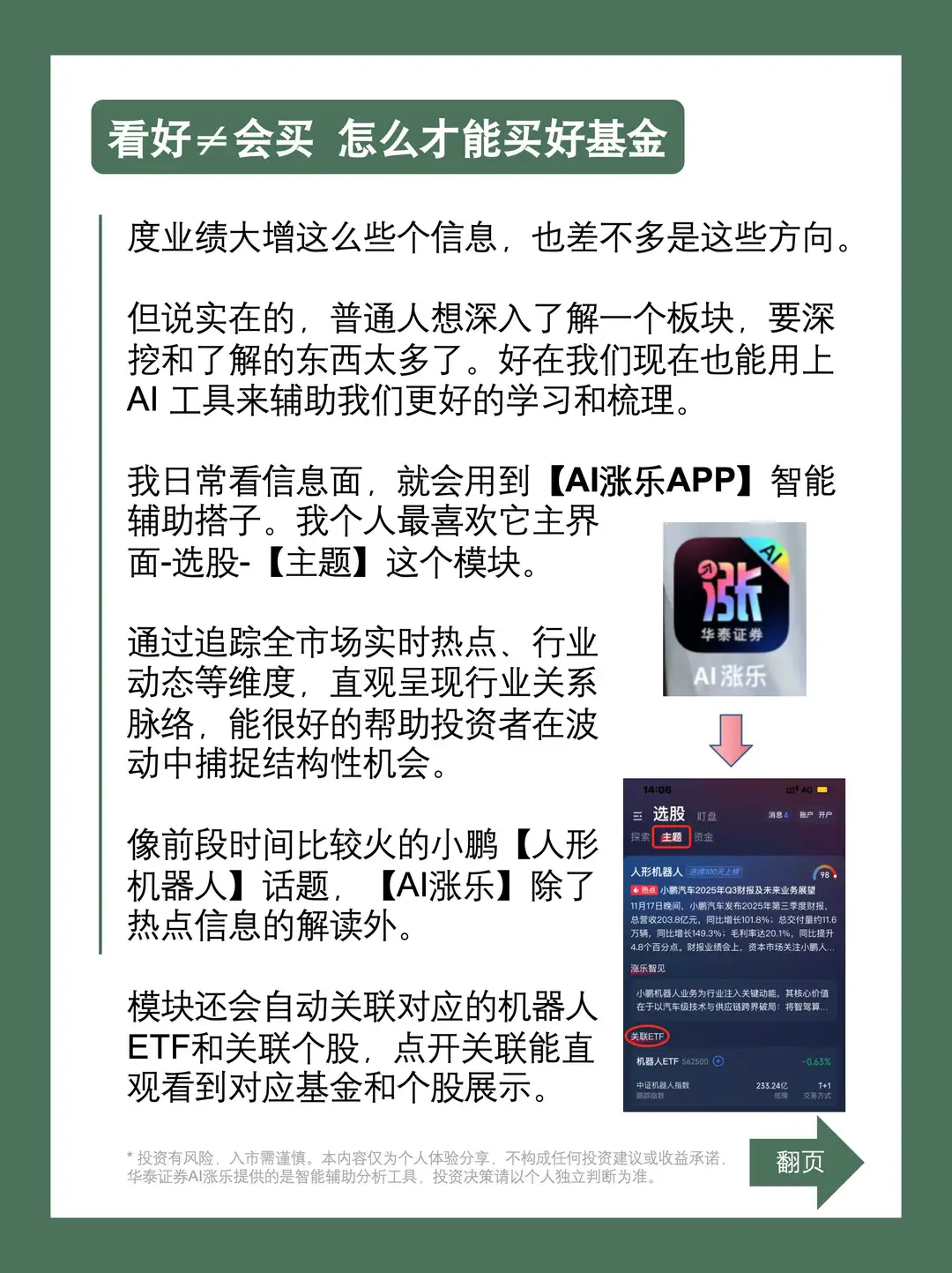 我日常看信息面,就会用到【AI涨乐】智能辅助搭子。用的最多的是它主界面-选股-【主题】模块。前段时间比较火的小鹏【人形机器人】话题,除了热点信息解读外,模块会自动关联对应的机器人ETF和个股,点开关联能直观看到基金和个股展示,如果对这个细分看好且有意向买一些,这个功能就非常好用,你对应关联选一只就可以了,不需要买一堆。另外它的AI 智能问答也很好用,我试问了一下机器人ETF近3个月的回调情况,它不仅把具体回撤数值告诉了我,走势图也同步输出,文字+图形的参考就很方便我很好很快做出买入、卖出、仓位管理等投资决策。