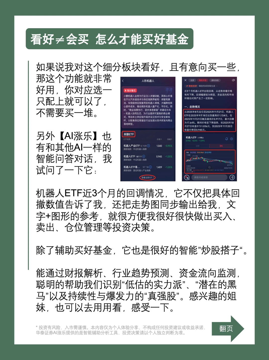 除了辅助买好基金,它也是很好的智能“炒股搭子”,通过财报解析、行业趋势预测、资金流向监测,能聪明的帮助我们识别“低估的实力派”、“潜在的黑马”以及持续性与爆发力的“真强股”。感兴趣的姐妹可以去用用看。