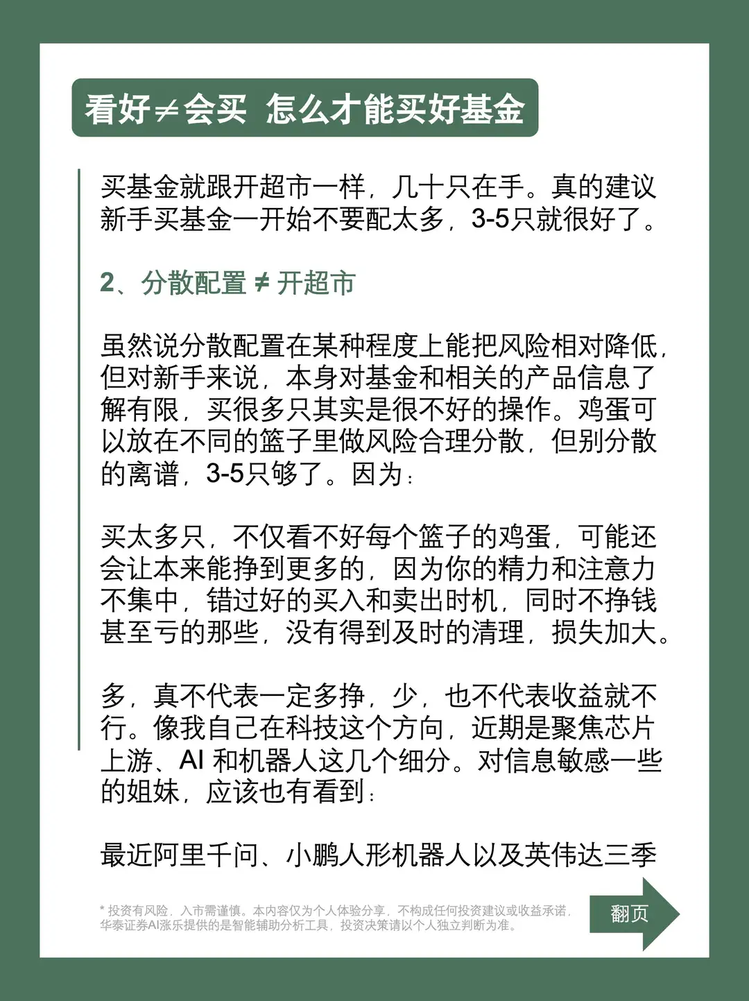 对新手来说,基金和相关产品信息了解有限,买很多是很不好的操作。鸡蛋可以放在不同的篮子里做风险合理分散,但别分散的离谱,3-5只就够了。买太多只不仅看不好每个篮子的鸡蛋,还会让本来能挣到更多的,因为精力和注意力不集中,错过好的买入和卖出时机,同时不挣钱甚至亏的没有得到及时的清理,损失加大。多不代表多挣,少也不代表收益不行。像我自己在科技这个方向,近期聚焦芯片上游、AI和机器人。信息敏感的姐妹,应该也看到最近阿里千问、小鹏人形机器人以及英伟达三季度业绩大增这些信息。想深入了解一个板块,我们要深挖和了解的东西真的多。好在现在也能用上AI工具来辅助我们学习和梳理。